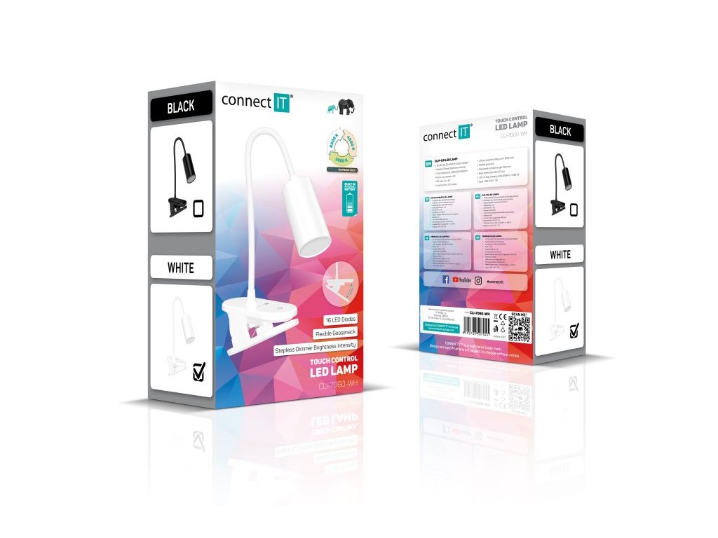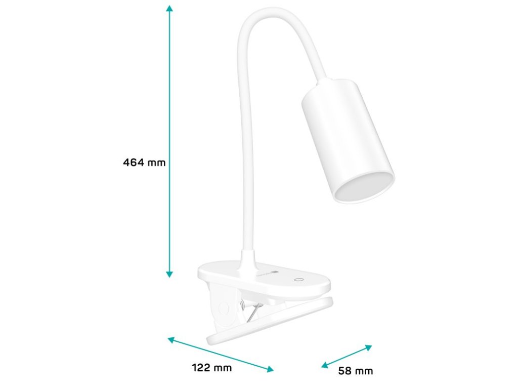 Díky flexibilnímu rameni nastavíte dokonalý úhel pro jakoukoliv práci. Lampička disponuje praktickým dotykovým spínačem, který umožňuje zapnout/vypnout lampu, plynule nastavit úroveň jasu světla nebo nastavit barevnou teplotu světla ve 3 různých úrovních (3000/4500/6500 K). Pomocí klipu můžete lampičku umístit nejen na Váš pracovní stůl, ale například na poličku, noční stolek či rám postele.