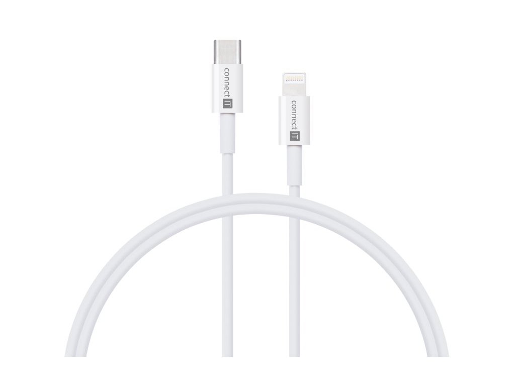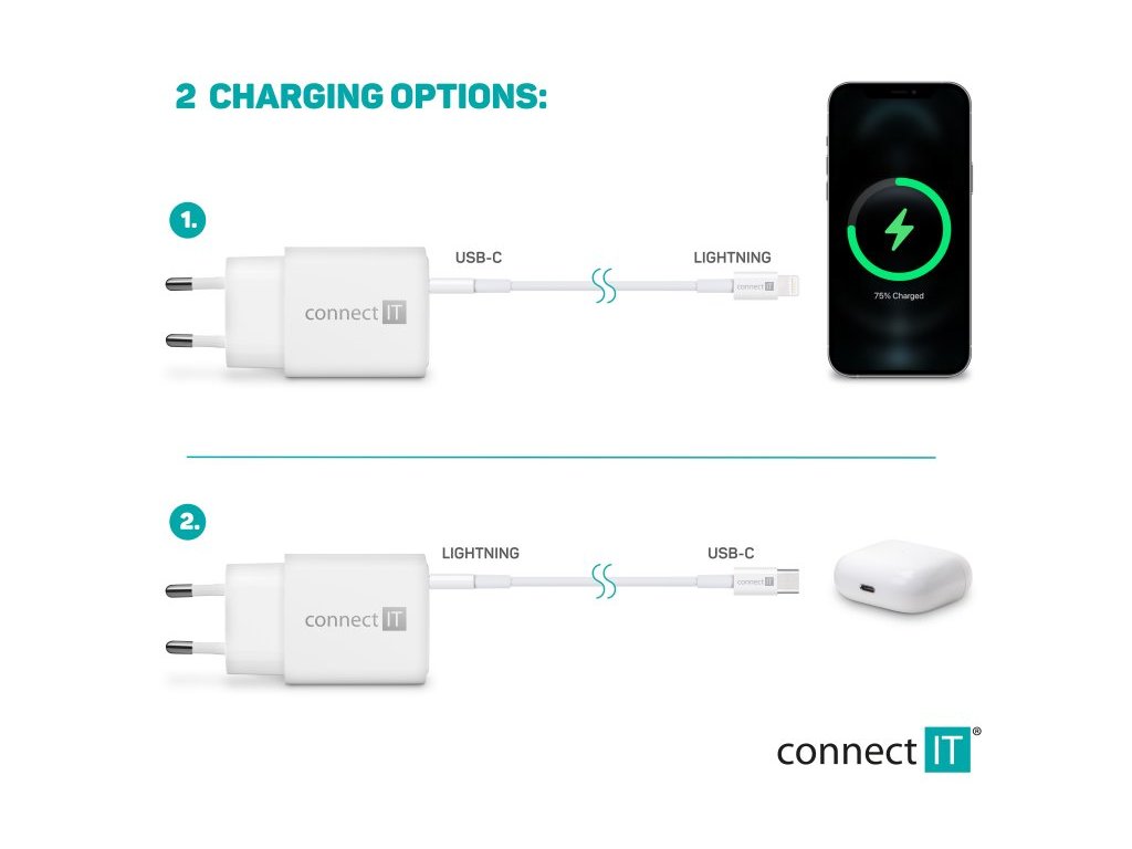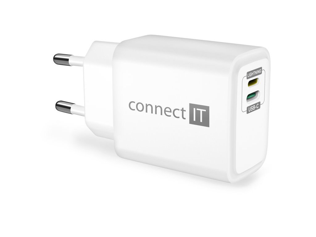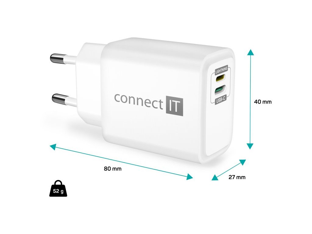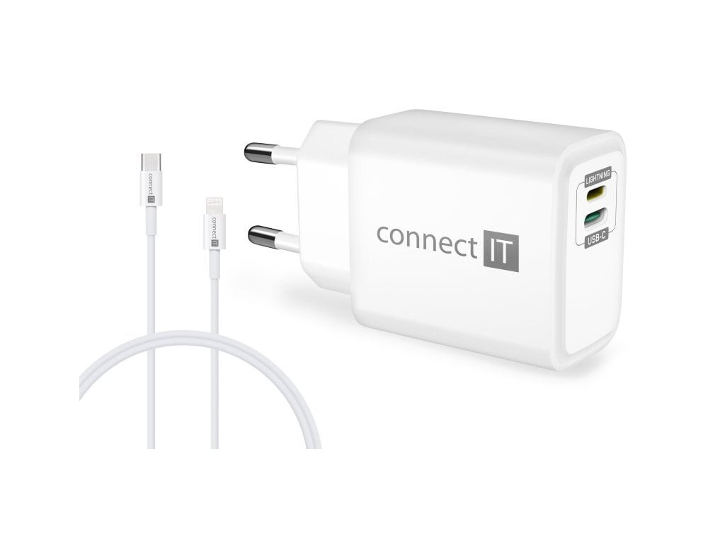 CONNECT IT DUPLEX Nabíjecí adaptér 1xLightning + 1×USB-C, 20W, kabel 27W, BÍLÝ
