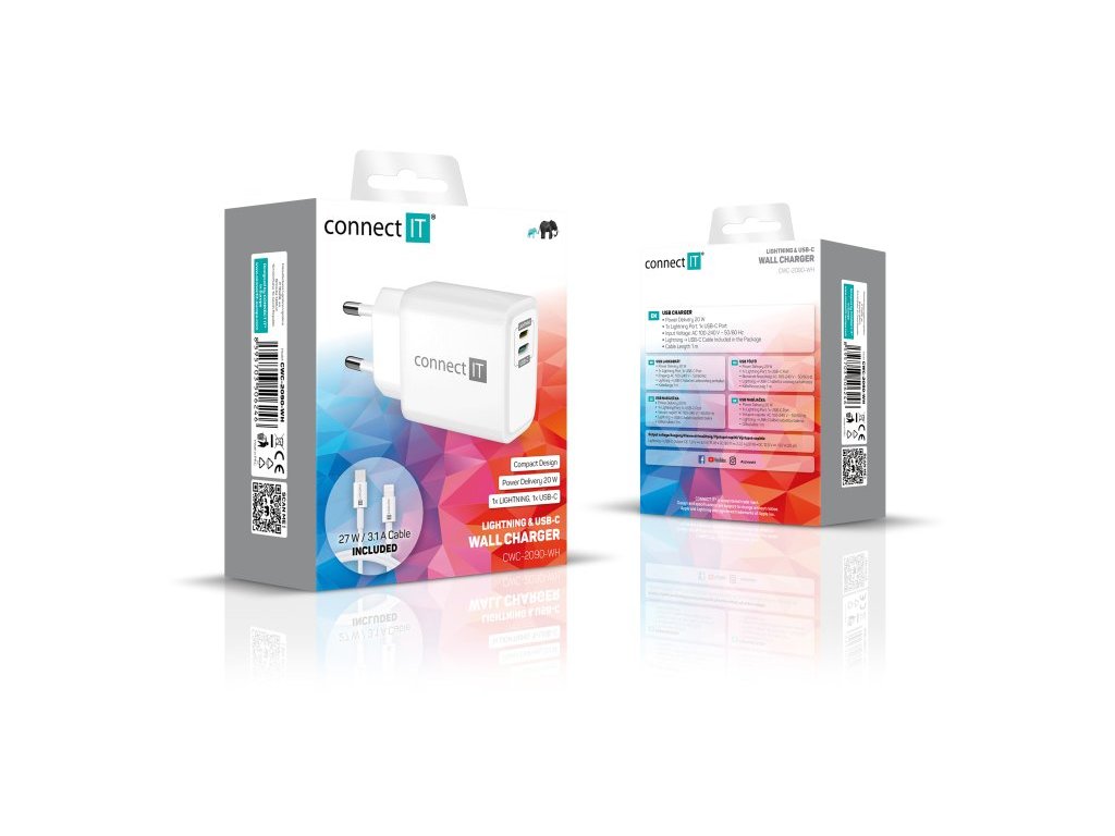 Unikátní cestovní nabíječka CONNECT IT "Duplex" disponuje dvěma porty - Lightning a USB-C. Díky této ojedinělé technologii lze nabíjet zařízení jak s Lightning vstupem, tak USB-C vstupem jedním univerzálním kabelem. Nabíječka je určená pro napájení i nabíjení mobilních telefonů, tabletů, power bank, akčních kamer, elektronických čteček knih, MP3 a MP4 přehrávačů, herních konzolí a mnoha dalších přenosných zařízení doma, v kanceláři i na cestách. Technologie Power Delivery (PD) umožňuje rychlonabíjení o výkonu 20 W. Součástí balení je i velice kvalitní kabel Lightning -> USB-C, který dokáže přenést až 27 W.