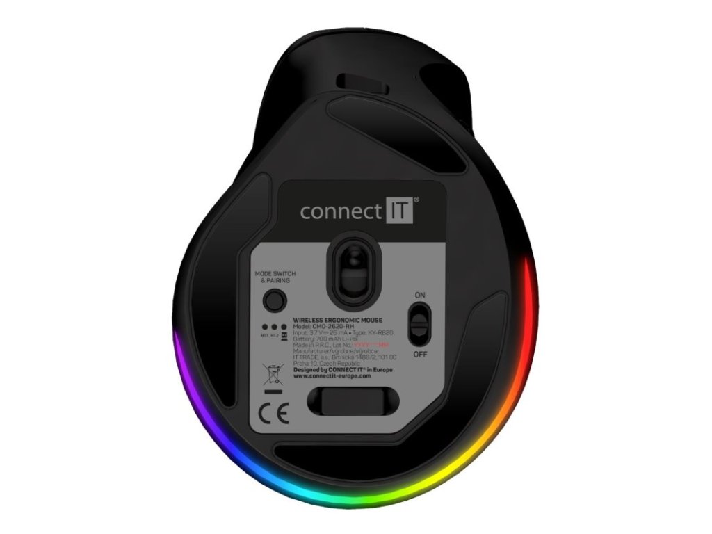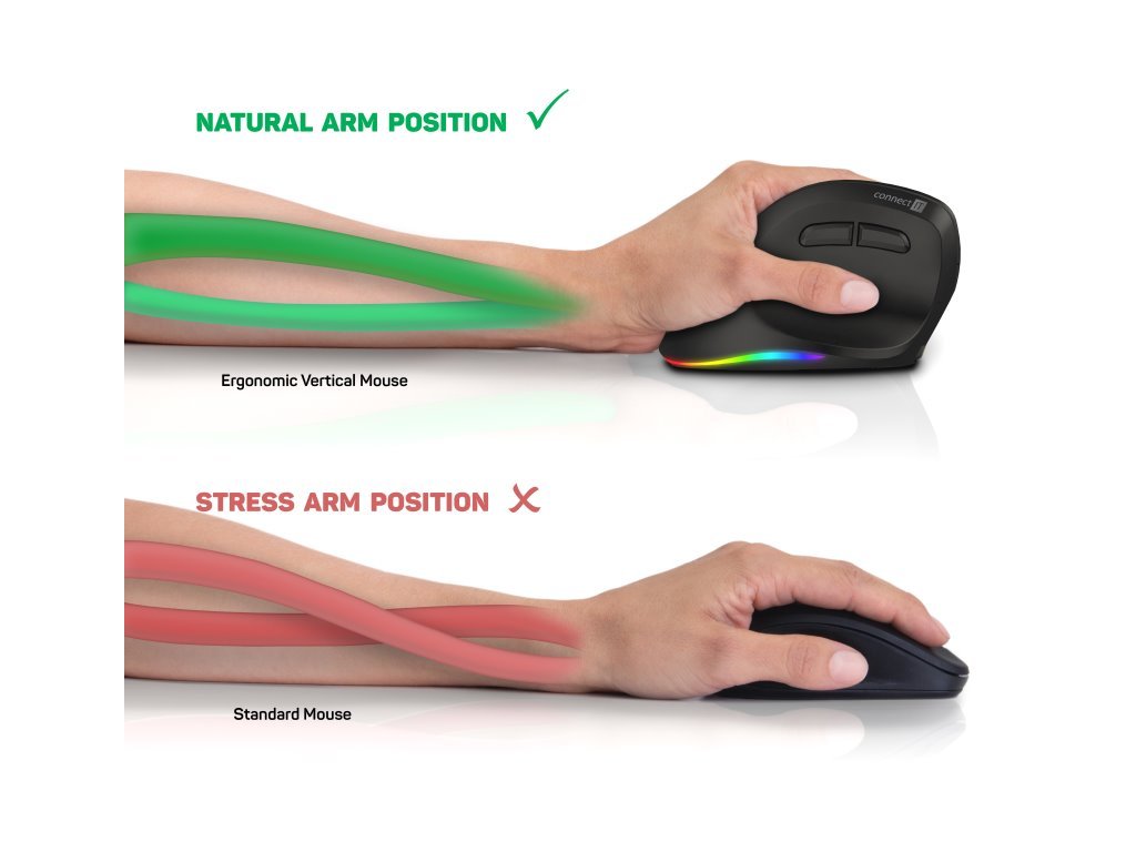Vertikální ergonomická optická bezdrátová myš pro leváky, určená speciálně jako prevence proti syndromu karpálního tunelu. TriMode (2x Bluetooth 5.0 + 2.4 GHz wireless), 2400DPI, RGB