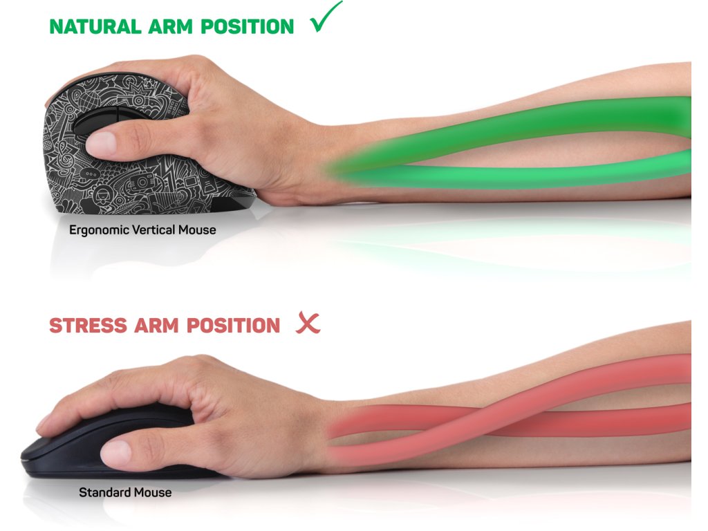 Při práci s běžnou počítačovou myší jsou kosti předloktí v nepřirozeně zkřížené poloze a již po krátké době dochází k bolestem a únavě celého předloktí. Při dlouhodobém používání takové myši může dojít k chornickým problémům s nutností vyhledat lékařskou pomoc.