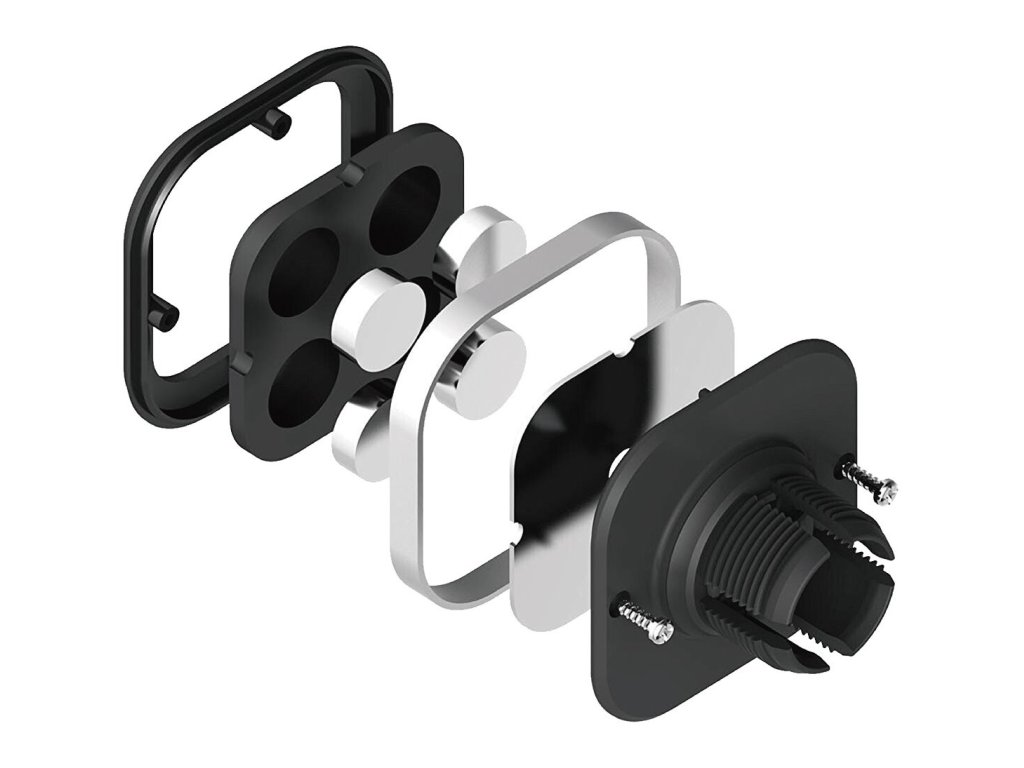 Skládá se ze dvou hlavních částí - ze samotného držáku a dvou verzí kovových destiček, které se buď přímo nalepí na zadní stranu telefonu, nebo se vloží do pouzdra mobilního telefonu