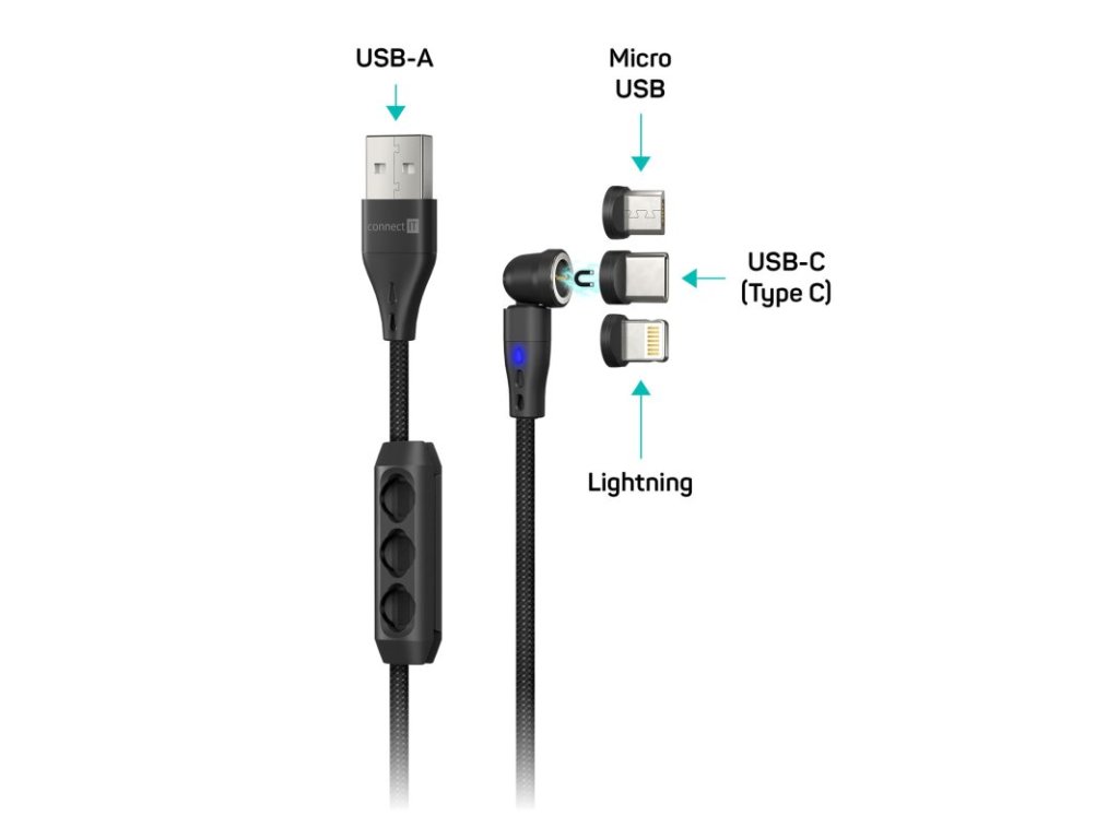 3 x magnetický konektor (USB-C, Lightning, MicroUSB)