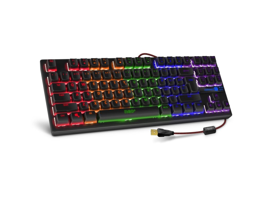 Profesionální mechanická klávesnice NEO+ series pro hráče počítačových her v českém a slovenském layoutu s celkem 22 přednastavenými módy barevného rainbow podsvícení a 1 módem s možností uživatelského nastavení. K dispozici je 12 multimediálních kláves.