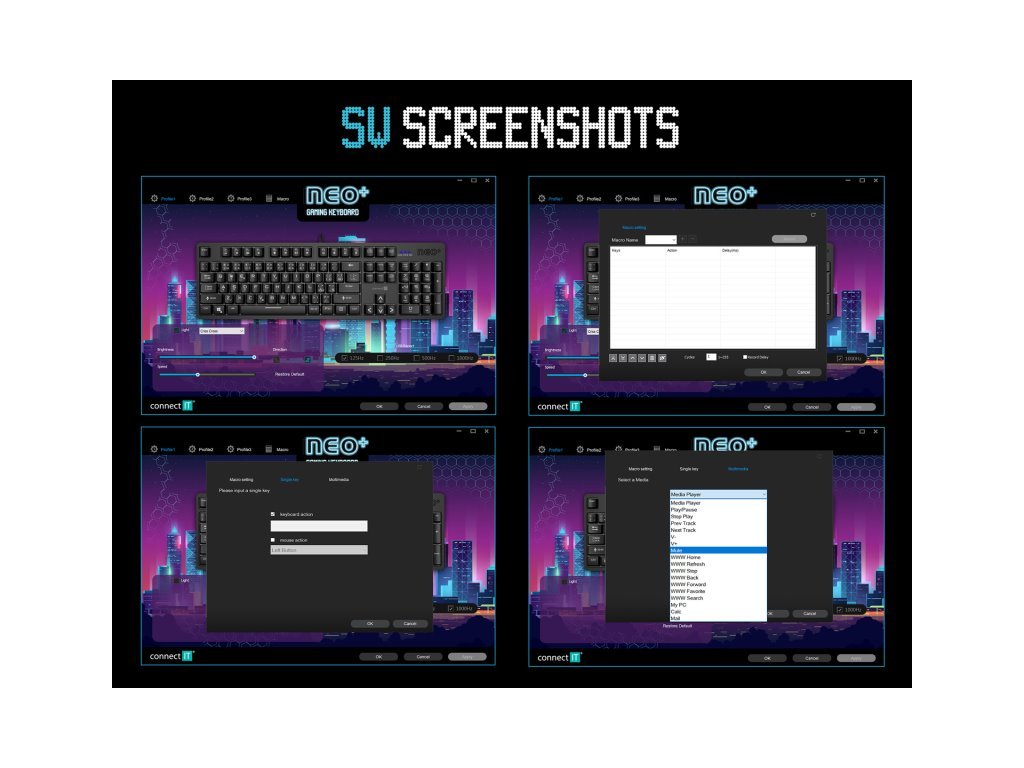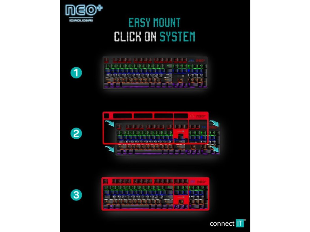 Kromě klasických herních funkcí, tato klávesnice disponuje mechanickými spínači s životností až 50 miliónů kliknutí. Další výhodou této klávesnice spočívá v její základně, vedou z ní totiž 3 drážky v různých směrech, díky kterým vám nebude překážet kabel od klávesnice. Balení obsahuje odnímatelný červený rámeček, který kompletně změní vzhled klávesnice. K této klávesnici je dodáván software ke stažení zcela zdarma na stránkách www.connectit-europe.com. Samozřejmostí je u této série prémiový oplet přívodního kabelu a pozlacený USB konektor. V balení také naleznete arch 7 promo samolepek "NEO".