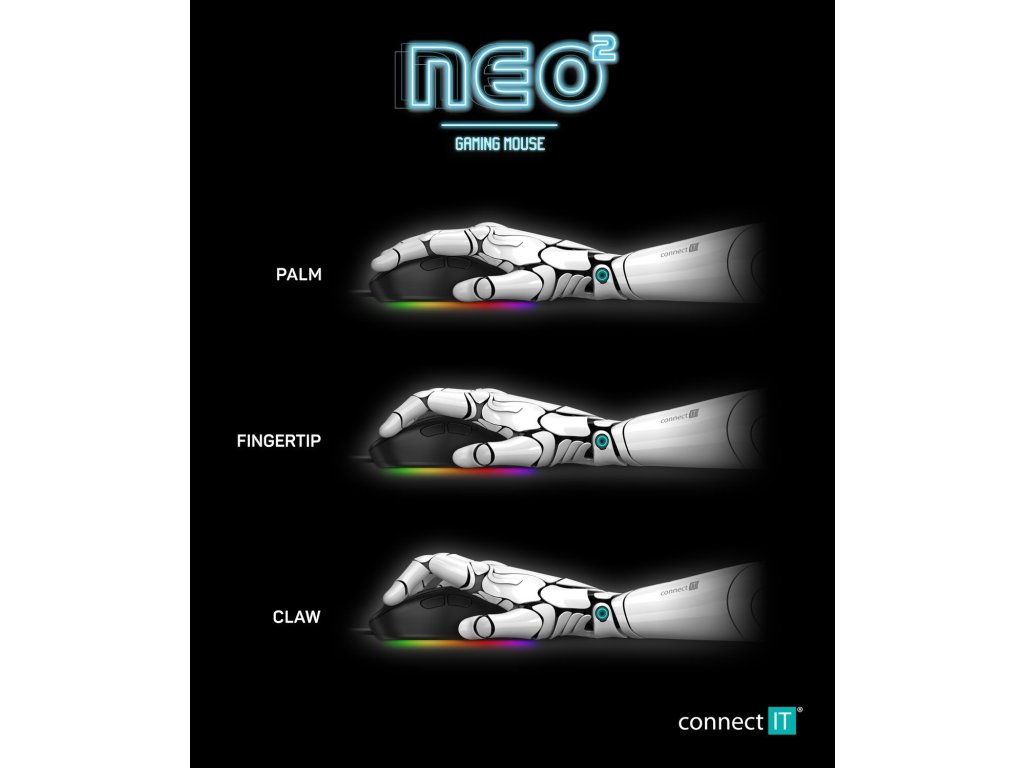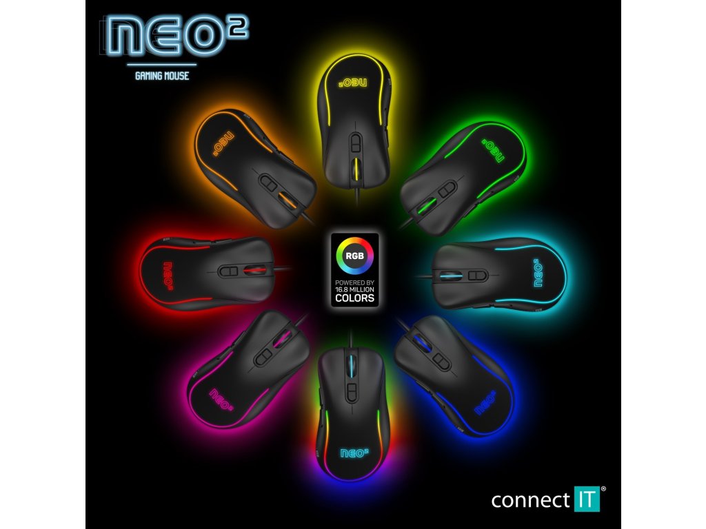 Connect IT Neo 2, myš optická, herní, USB, 7200dpi, RGB podsvícení, 7 tlačítek, posuvné kolečko, kabel 150cm