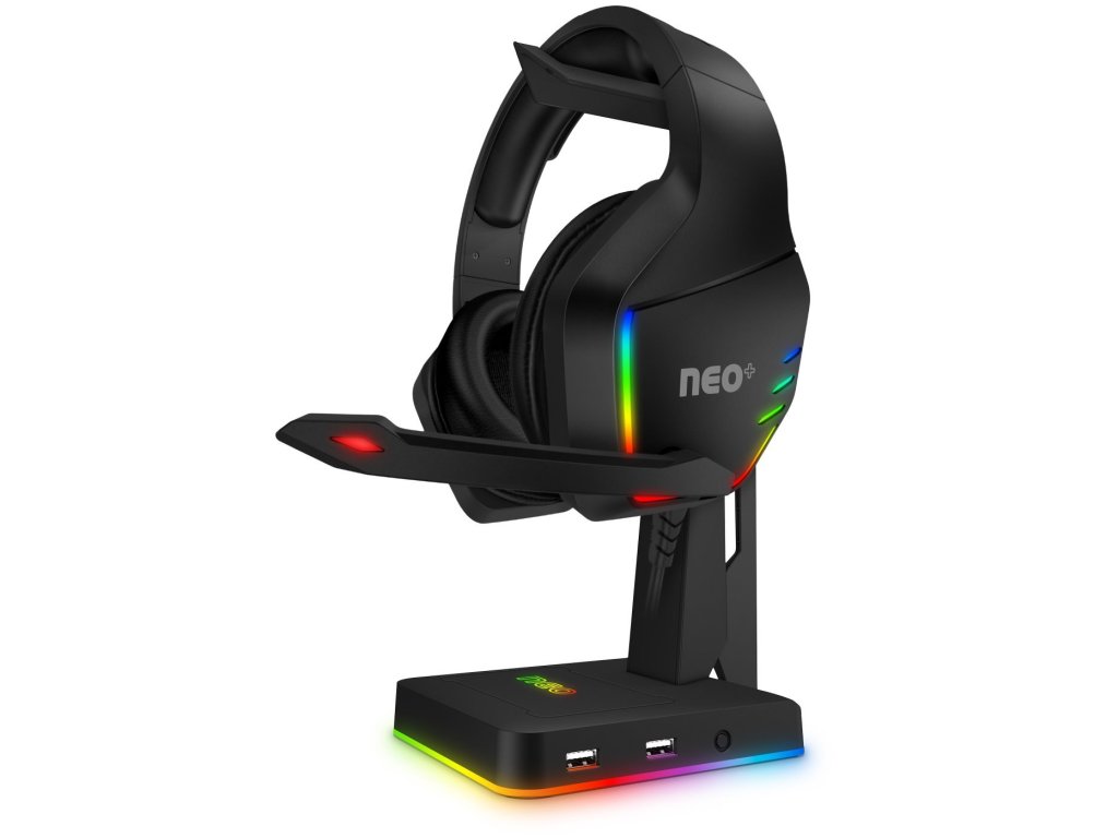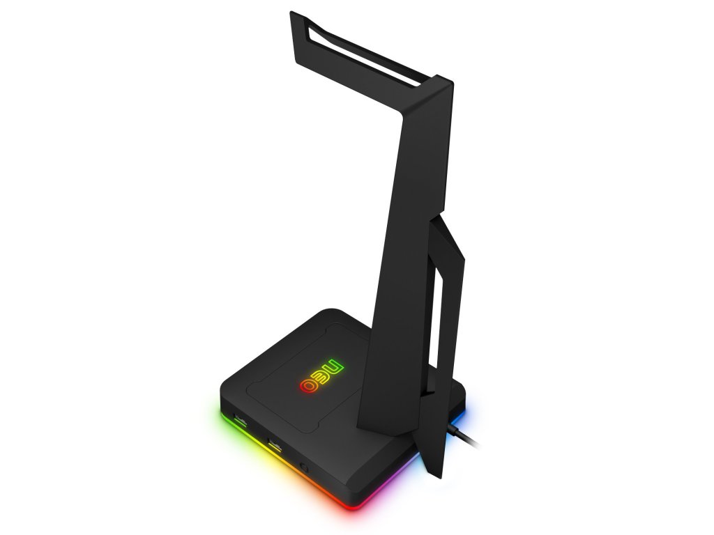 Praktický stolní stojánek na sluchátka pro domácí i profesionální použití s RGB rainbow color flow podsvícením a dvěma USB 2.0 porty.