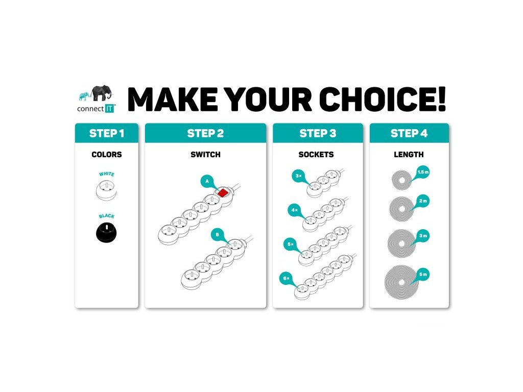 CONNECT IT prodlužovací kabel 230 V, 4 zásuvky, 3 m, s vypínačem (černý)
