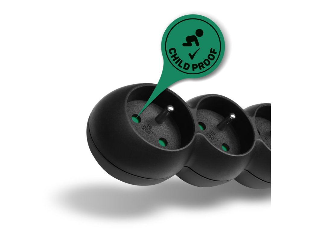Prodlužovací kabelový přívod na 230V je vybaven dětskou ochranou všech zásuvek – zásuvky jsou přístupné pouze v případě zasunutí obou vidlic najednou, nelze tedy zasunout jednotlivě např. pouze šroubovák nebo pletací jehlici.