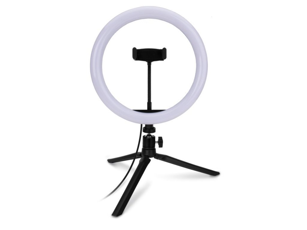 kruhové 10" selfie LED světlo se stativem, držák na mobil a kulová hlava, 3 úrovně teploty světla