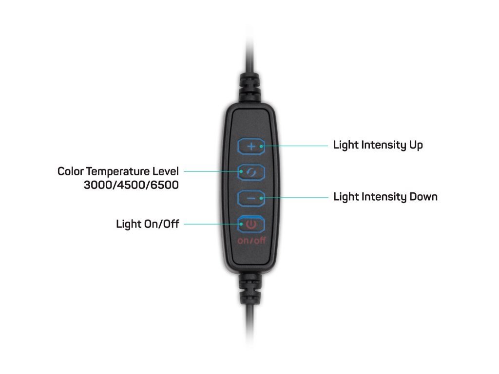 Absolutní svobodu nastavení požadovaného úhlu garantuje kulová hlava. Barevnou teplotu světla je možno nastavit od studené až po teplou ve třech úrovních. Držák mobilního telefonu umístěný na flexibilním husím krku umožňuje pohodlné nastavení do libovolného snímacího úhlu fotografií a videí. Ve výbavě nechybí dálkový ovladač pro vypnutí/zapnutí světla, nastavení jeho intenzity nebo barevné teploty.