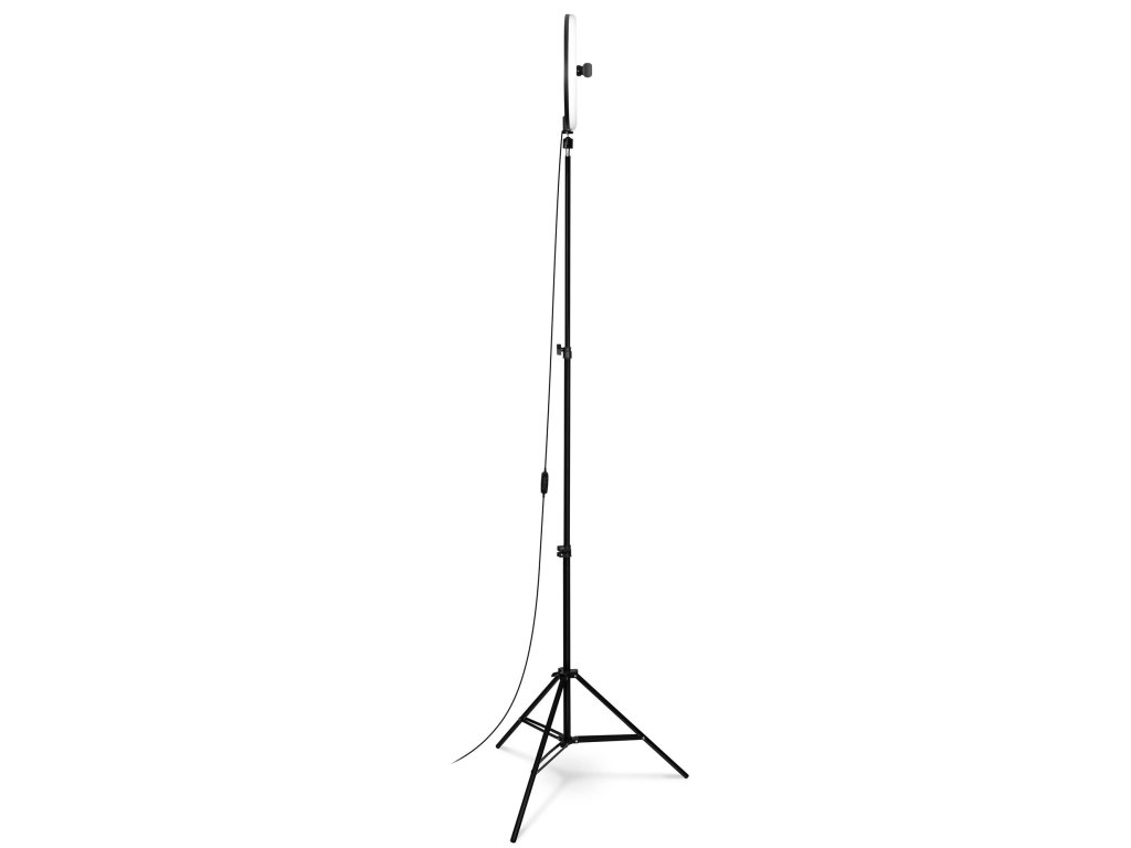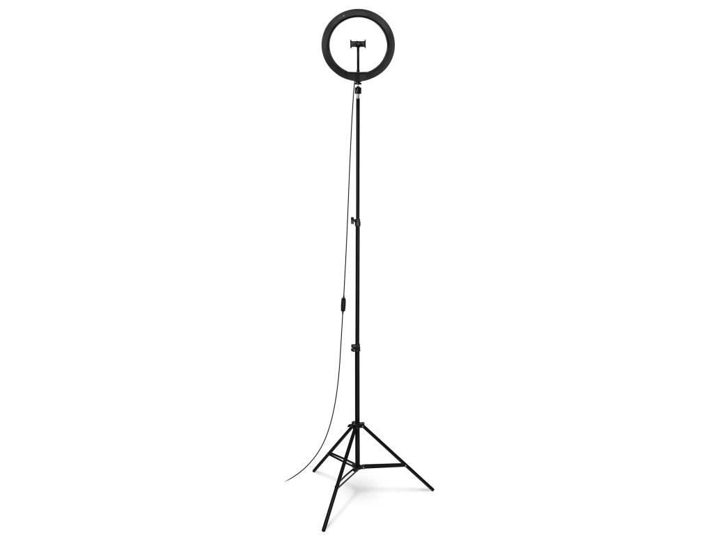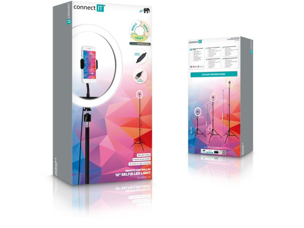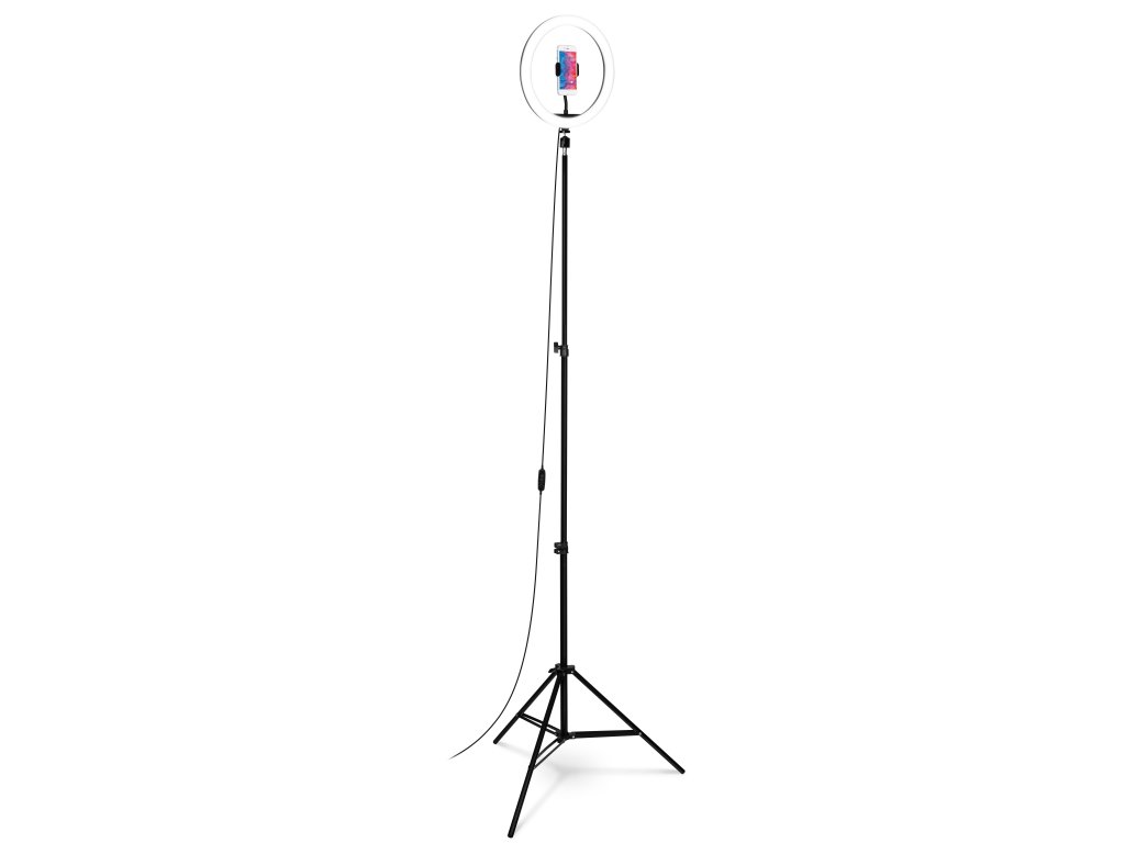 Kruhové selfie LED světlo "Selfie12Ring" s flexibilním držákem na mobilní telefon, stativem s maximální výškou 210 cm, kulovou hlavou a dálkovým ovládáním pro domácí i profesionální použití umožňuje nastavit barevnou teplotu světla na 3 různé úrovně (3000/4500/6000 K).