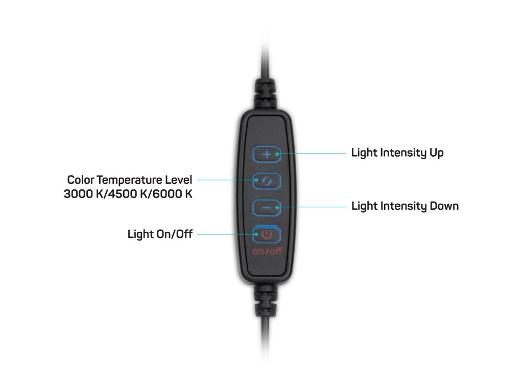 Absolutní svobodu nastavení požadovaného úhlu garantuje kulová hlava. Barevnou teplotu světla je možno nastavit od studené až po teplou ve třech úrovních. Držák mobilního telefonu umístěný na flexibilním husím krku umožňuje pohodlné nastavení do libovolného snímacího úhlu fotografií a videí. Ve výbavě nechybí dálkový ovladač pro vypnutí/zapnutí světla, nastavení jeho intenzity nebo barevné teploty.