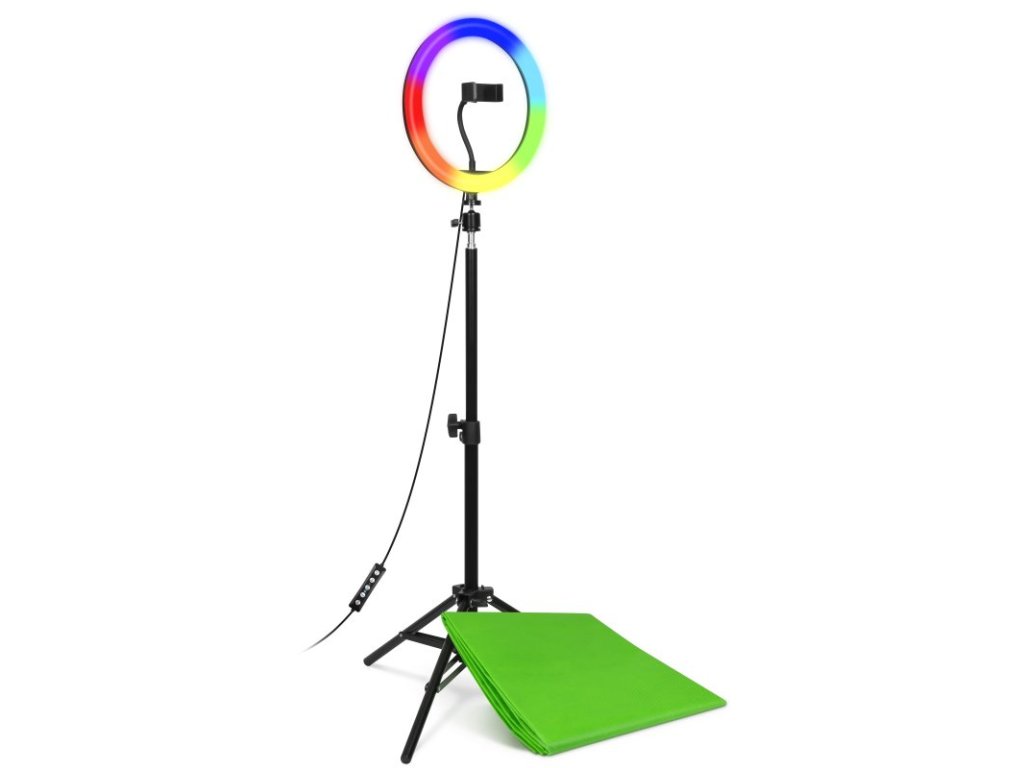 Kruhové selfie LED světlo "Selfie10RGB" s flexibilním držákem na mobilní telefon, stativem s kulovou hlavou a dálkovým ovládáním pro domácí i profesionální použití umožňuje nastavit 7 statických barev, 8 dynamických efektů a barevnou teplotu světla ve 3 různých úrovních (3200/4300/5500 K).