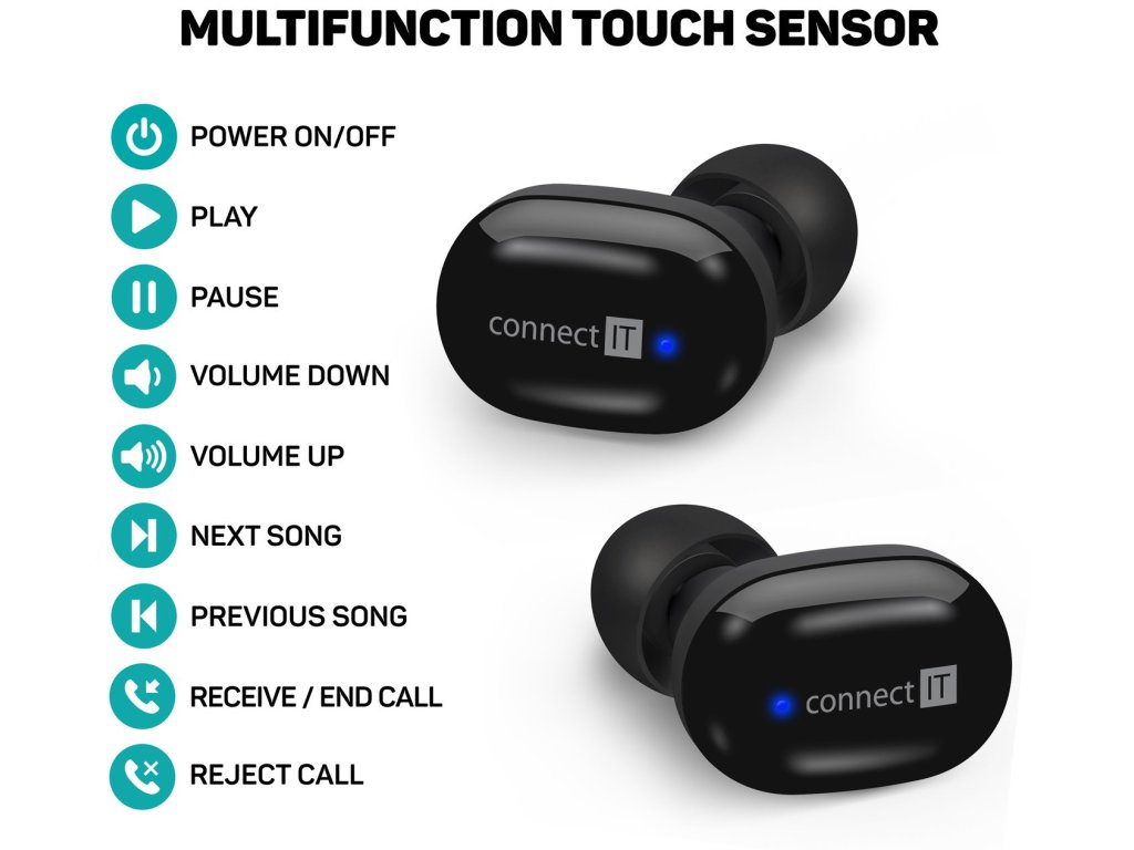 Přenosná bezdrátová Bluetooth True Wireless SensorTouch sluchátka s nabíjecí powerbankou CONNECT IT CEP-7100-BK.