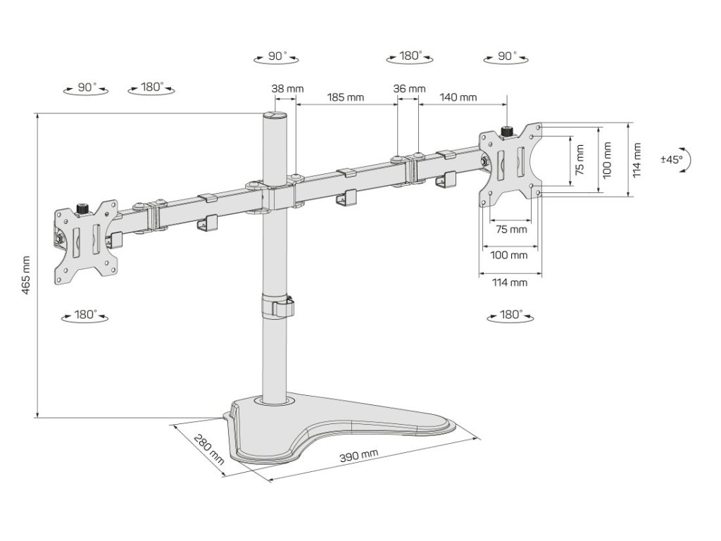 stolní držák pro dva monitory 13" - 32", standard VESA max 75x75, 100x100, nosnost 2x8kg, otočný, možnost naklánění