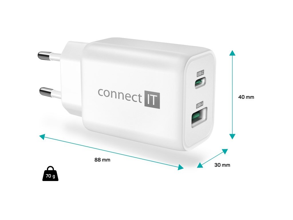 CONNECT IT Wanderer2 GaN nabíjecí adaptér 1×USB-C + 1xUSB-A, 33W PD, bílá
