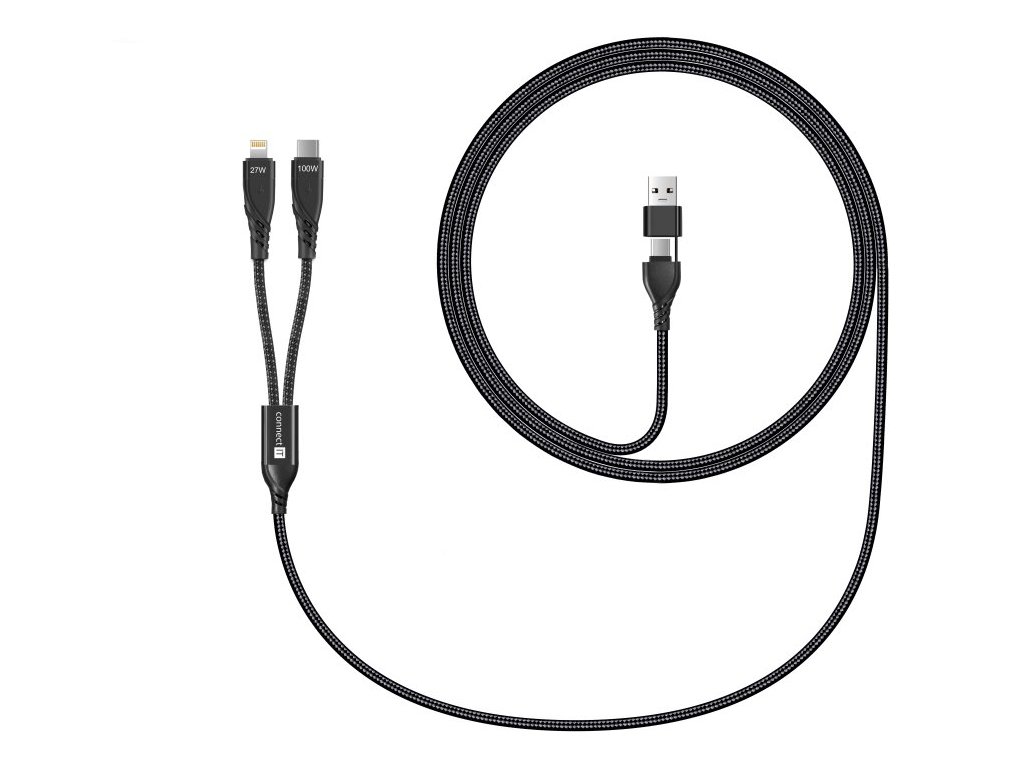 Univerzální nabíjecí kabel 4v1 pro nabíjení zařízení s konektory 1x USB-C a 1x Lightning se vstupním konektrom USB-C a redukcí na USB-A. Umožňuje nabíjení až dvou zařízení současně s podporou rychlého nabíjení pomocí max. proudového toku 5 A. Speciální manžetová nadstavba konektorů zaručuje lepší přístupnost k nabíjecím zdířkám mobilních telefonů v pouzdrech.