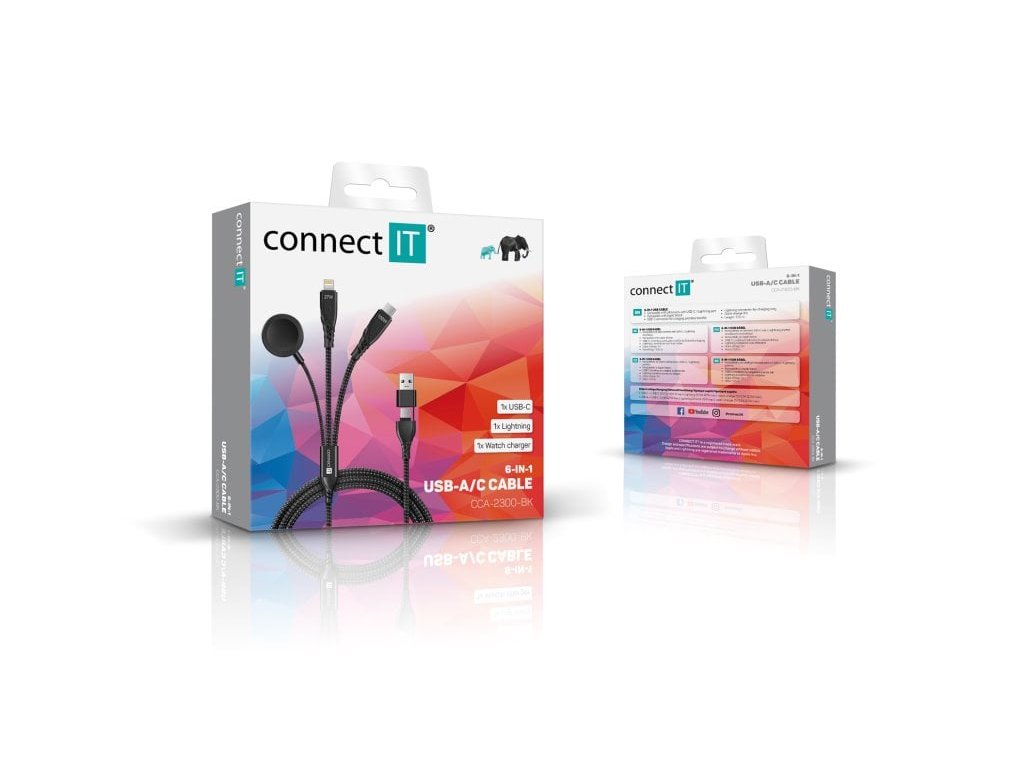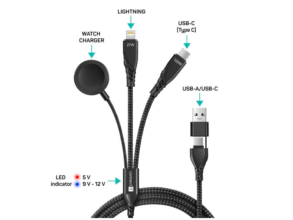 Univerzální nabíjecí kabel 6v1 pro nabíjení zařízení s konektory 1x USB-C, 1x Lightning a 1x nabíječka na chytré hodinky (kompatibilní s Apple Watch) se vstupním konektrom USB-C a redukcí na USB-A. Umožňuje nabíjení až tří zařízení současně s podporou rychlého nabíjení pomocí max. proudového toku 5 A. Speciální manžetová nadstavba konektorů zaručuje lepší přístupnost k nabíjecím zdířkám mobilních telefonů v pouzdrech.