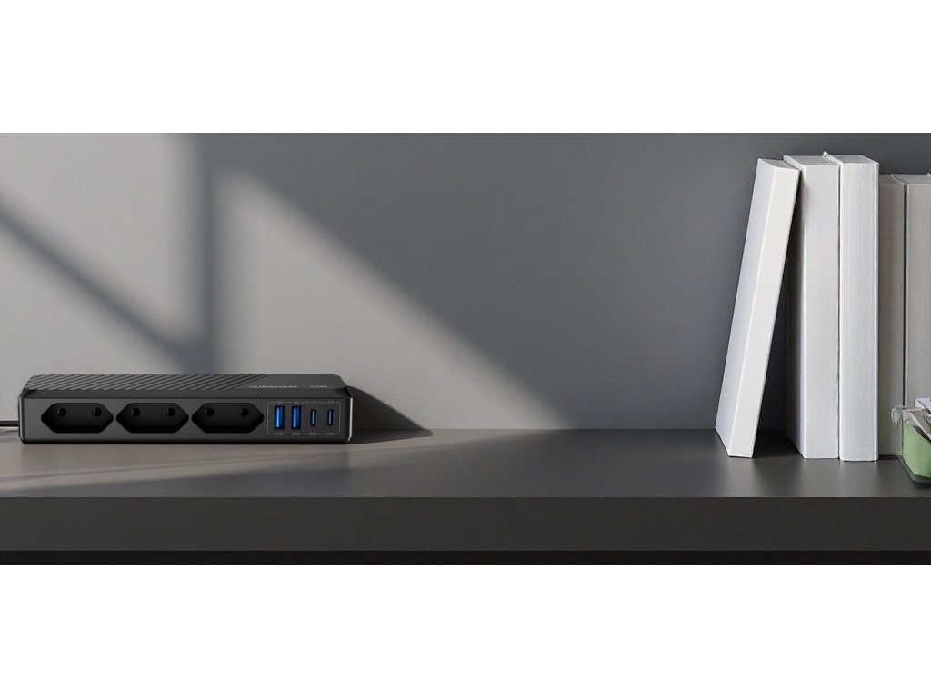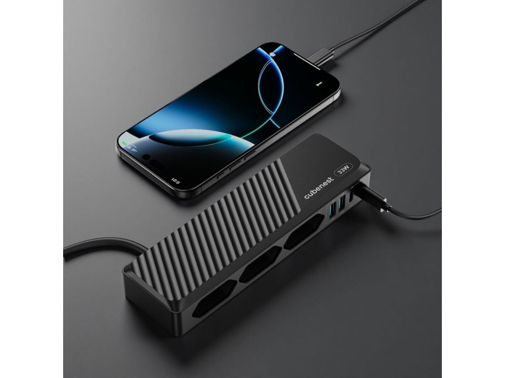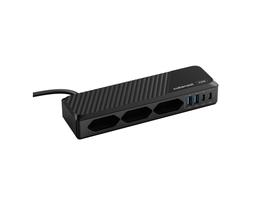 Rychlonabíječka Cubenest 7v1 s GaN technologií pro max. efektivitu • Nabíjí 7 zařízení současně (vč. notebooků) • 3x AC zásuvky a 4x USB porty (2x USB-C 33W, 2x USB-A 27W) • Kompaktní design s montáží pod stůl • Kompletní ochrana
