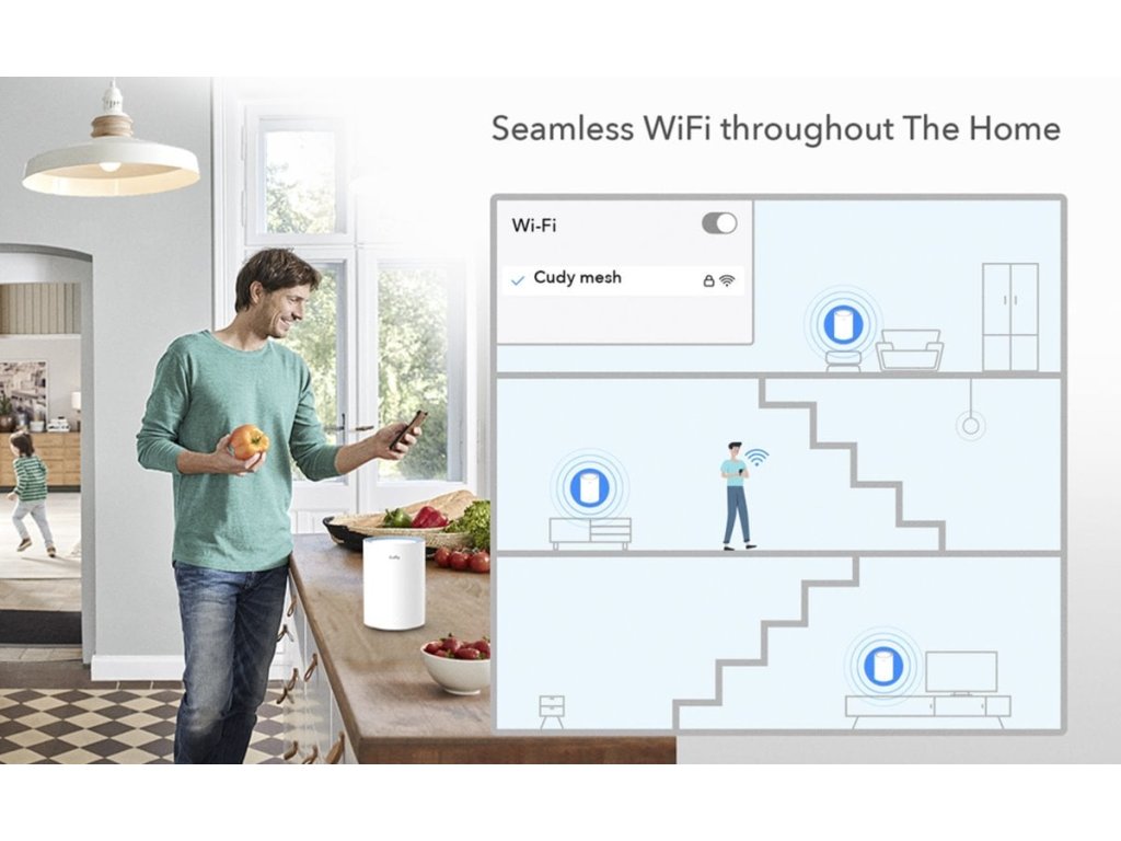 Mesh systém není nic jiného než sada routerů pro použití v domácnostech, bytech, kancelářích, kde je pokrytí Wi-Fi sítí z jednoho routeru příliš slabé. Více Mesh jednotek si mezi sebou automaticky předávají klienty a komunikují mezi sebou pouze bezdrátově. Balení obsahuje tři zařízení, která jsou již vzájemně nakonfigurována a nevyžadují zásah uživatele kromě nastavení názvu Wi-Fi. Ideální řešení pro pokročilé i laiky v oblasti správy sítí a budování velké bezdrátové sítě.