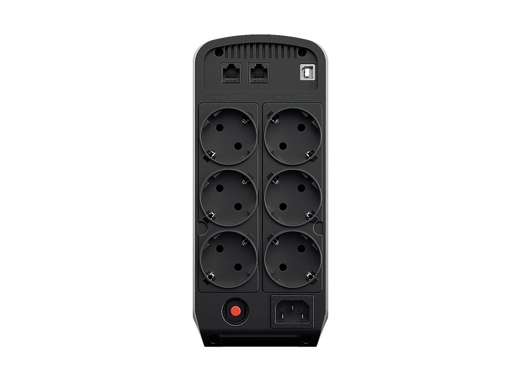 Výstupní zásuvky - 6x SCHUKO (německé) - 3 zálohované, 3 jen s přepěťovou ochranou