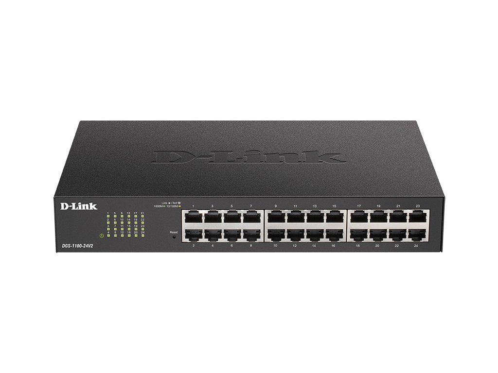 D-Link DGS-1100V2 je nová generace Gigabit Smart řízených přepínačů určených pro malé a střední podniky (SMB), pracovní skupiny (workgroup) a kanceláře (SOHO). Model DGS-1100-24V2 je osazen 24 metalickými porty 10/100/1000Base-T RJ-45. Je v kovovém provedení o velikosti 1U a šířce 11" (28cm). Součástí dodávky jsou držáky pro instalaci do 19" rozvaděče. Provedení bez větráků zajišťuje tichý chod, switch lze umístit i přímo v kanceláři na stůl či poličku.