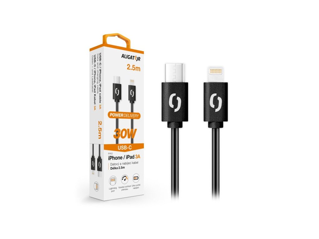 ALIGATOR POWER špičkový USB-C/Lightning kabel nejvyšší kvality, o výkonu 30W a možností nabíjení až 3A.