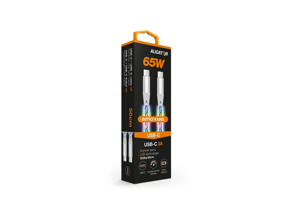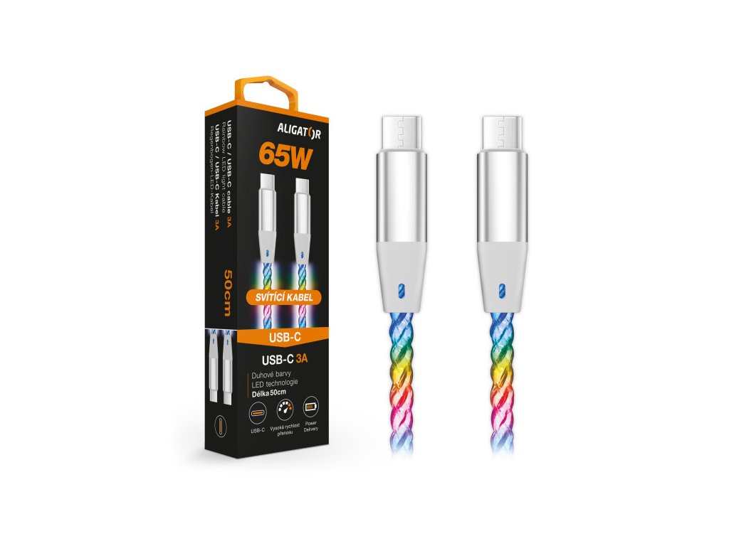 Duhově svítící LED kabel řady ALIGATOR POWER s kovovými konektory USB-C/USB-C nejvyšší kvality, o výkonu 65W a možností nabíjení až 3A.