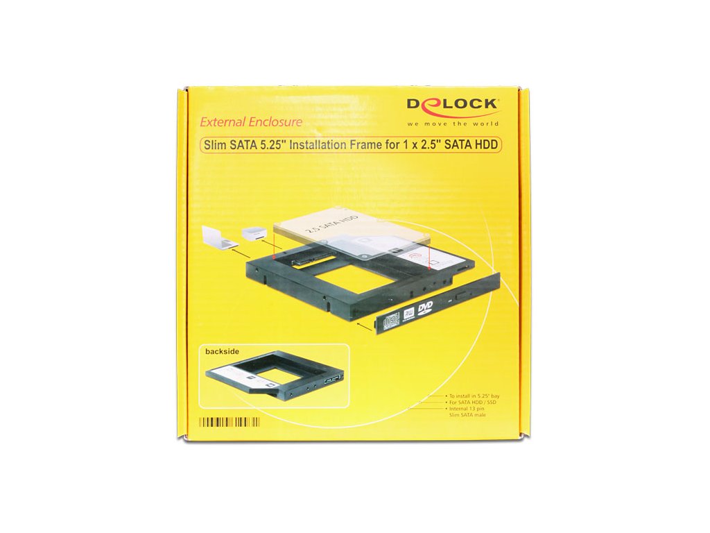 Tento Delock instalační rámeček může být instalován do 5,25" SATA slim slotu a je určen k provozu 2,5" SATA HDD. Součástí je i univerzální přední panel, který může být použit při instalaci v Mini PCnebo pokud nelze použít přední panel mechaniky vašeho notebooku.