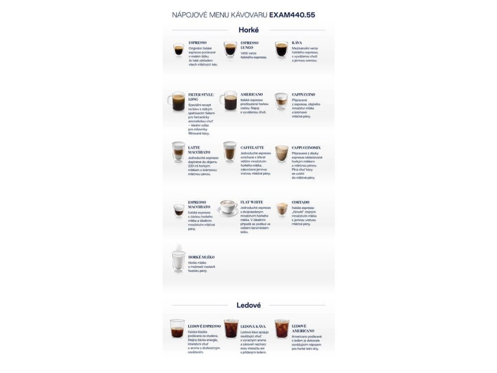 Typ nápoje: | espresso, mléčné kávové nápoje, ledová káva, filtrovaná káva |