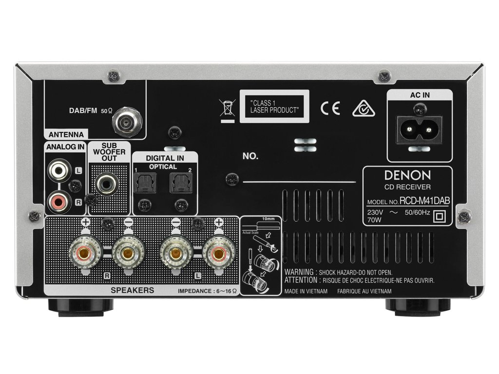 Na základě mnohonásobně oceněného modelu RCD-M40DAB, postavil Denon nový model RCD-M41DAB, který má vylepšený zvuk, styl a výbavu. Nově vyvinutý diskrétní analogový obvod zesilovače zkracuje signálové cesty pro větší čistotu zvuku a celkový výsledek, zatím co nová Bluetooth integrace kombinuje pohodlý s možností snadného vypnutí této funkce v době kdy jej nepoužíváte pro zamezení negativního vlivu na zvuk z jiných zdrojů. Design doznal kosmetických úprav také a více se v něm odráží prvky špičkových dělených modelů řady 'NE'. Centrální jednotka RCD-M41DAB má 2 digitální optické vstupy pro snadné připojení televize, set-top boxu nebo jiných digitálních zařízení zasluhujících si vyšší kvalitu zvuku. Také má vestavěnou CD mechaniku a FM tuner s DAB/DAB+. Přidejte ještě reproduktory SC-M41 a dostanete kompletní D-M41DAB systém s nejlepším HiFi zvukem.