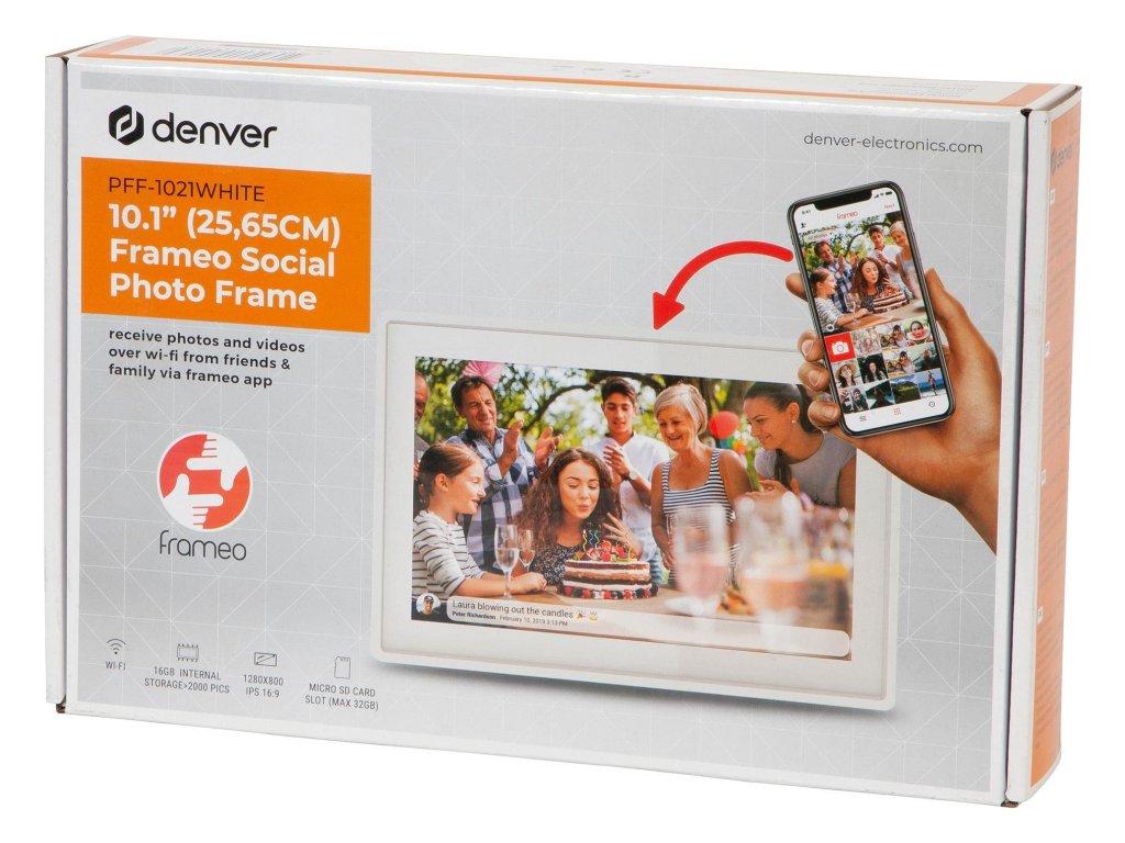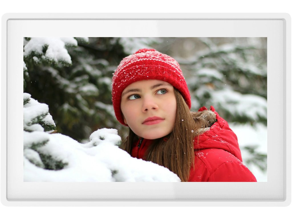 Digitální fotorámeček, 10,1" dotykový IPS displej s rozlišením 1280x800, 16 GB interní úložiště, WiFi, Frameo software, přenášení ze smartphonu, časovač, automatické vypnutí, bílý