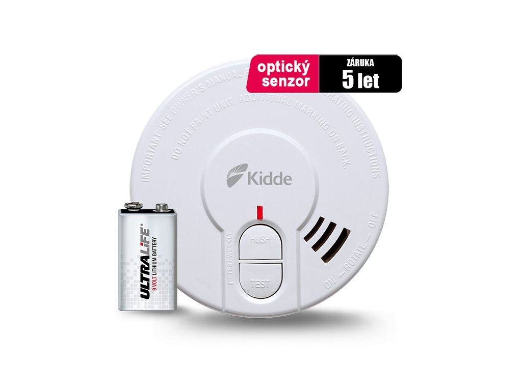 Detektor kouře Kidde 29HD-L určený k nepřetržitému monitorování ovzduší na přítomnost kouře a ohně s 9V lithiovou baterií pro napájení hlásiče po dobu až 5 let (součást balení).
