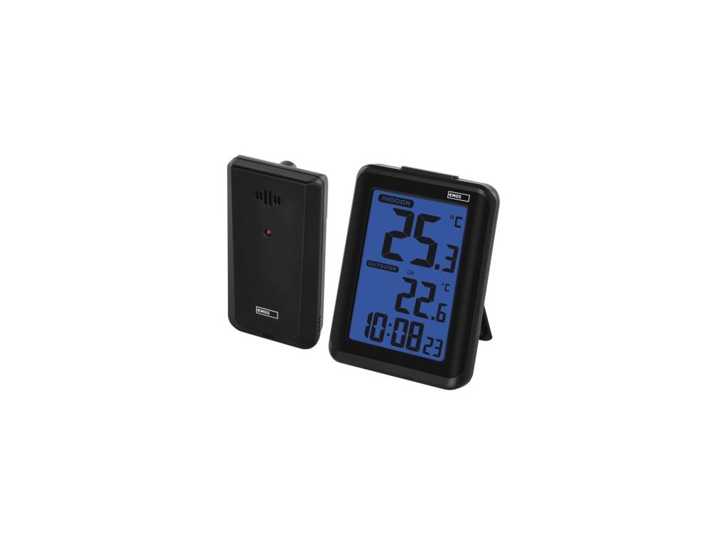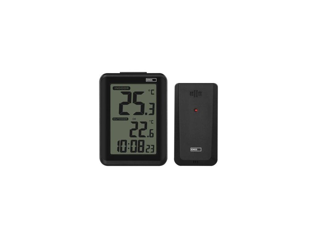 Bezdrátový teploměr s dosahem až 50 m měří vnitřní a venkovní teplotu (-30 °C až +60 °C) a vlhkost. Zobrazuje max. a min. hodnoty, má budík a možnost pověšení na zeď. Displej bez podsvícení, napájení na 2× AAA. Další čidlo (E05018) lze připojit.