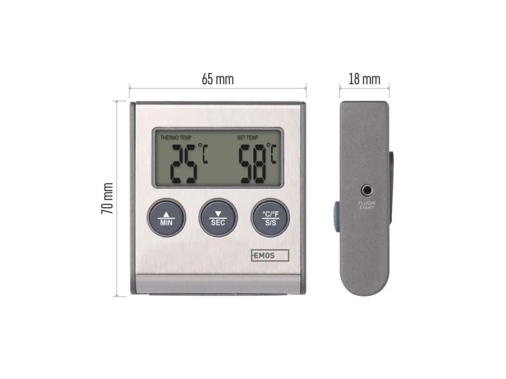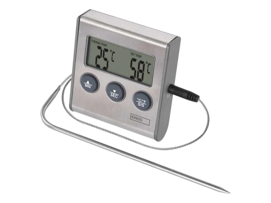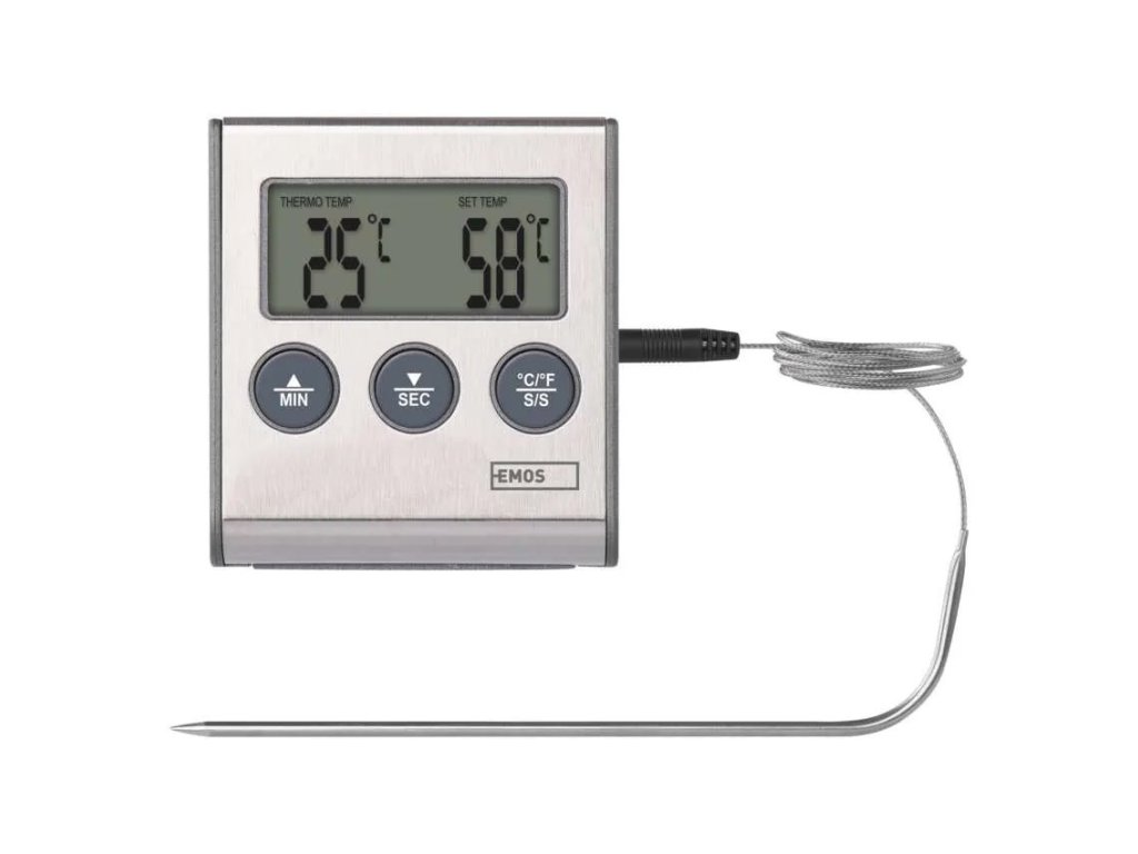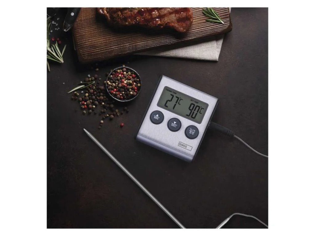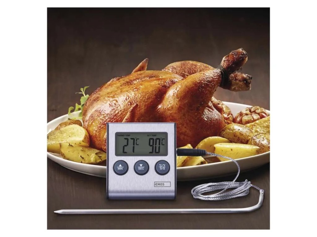 Teplotu měříte pomocí nerezové teplotní sondy s dostatečnou délkou přes jeden metr, aby dosáhla pohodlně od stolu do trouby nebo grilu.