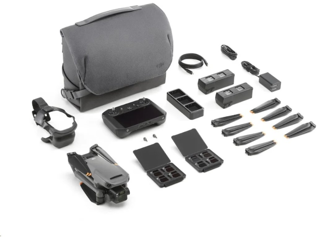 Dron DJI Mavic 3 s ovladačerm DJI RC PRO + dodatečné příslušenství, Hasselblad L2D-20c 20 MP kamera, 5,1K a 4K/120fps video, 10-bit D-Log barevný profil doba letu až 46 minut, přenos videa až na 15 km, rychlost až 21 m/s