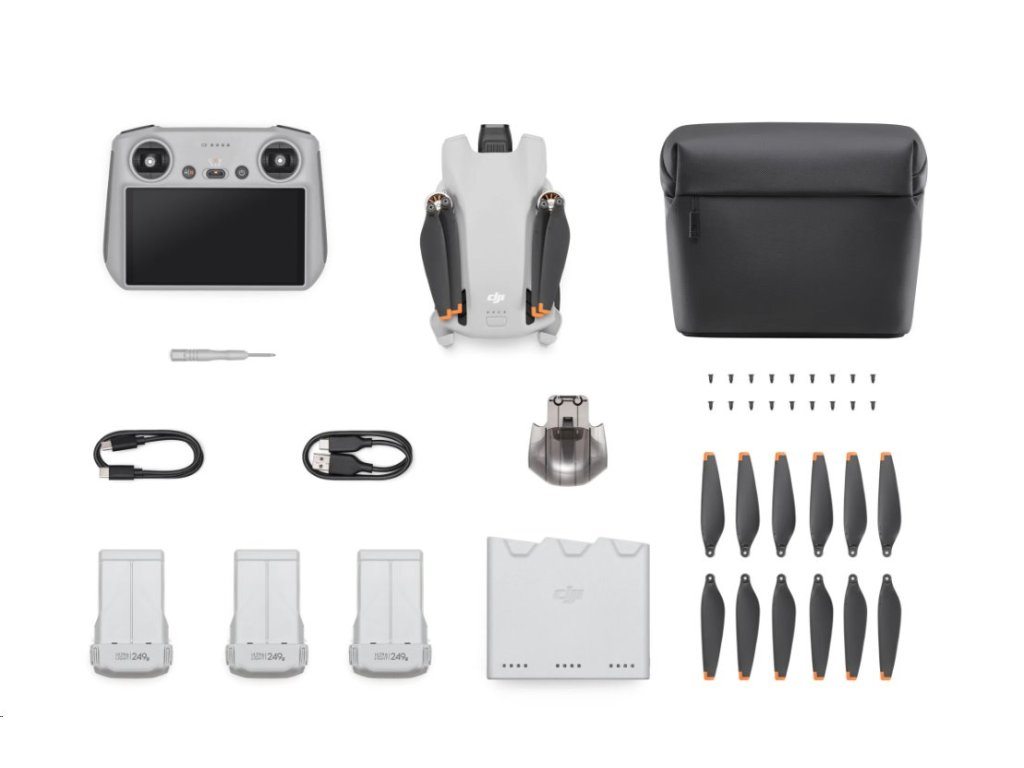 Dron DJI Mini 3 s ovladačem DJI RC + dodatečné příslušenství (3x baterie, 3x pár vrtulí, USB-C kabel, taška přes rameno, nabíjecí hub), hmotnost <249 g, doba letu až 38 minut, dolet až 18 km, 4K/30fps HDR video