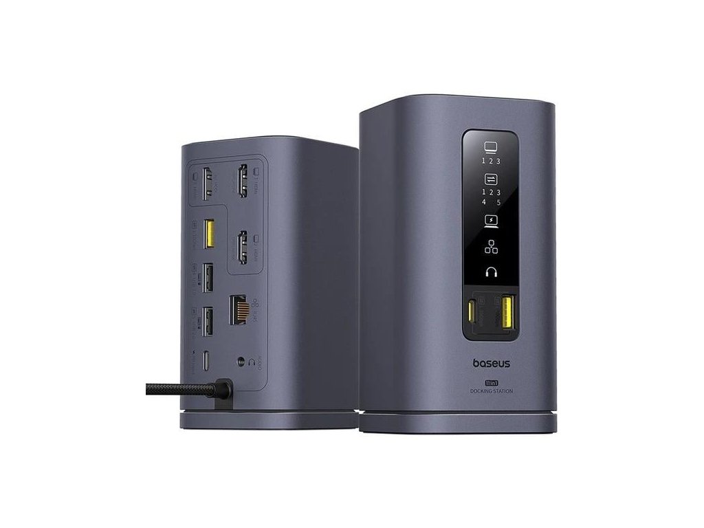 Dokovací stanice Baseus Spacemate, 11 portů - 2xUSB-C, 4xUSB, 3xHDMI, 1xRJ45, 3,5mm jack šedá,video výstupy: 2x HDMI, 2x DisplayPort s podporou 4K rozlišení, napájení: USB-C PD port 100W,kompatibilita Windows, MacOS, Android, Chrome OS, barva šedá
