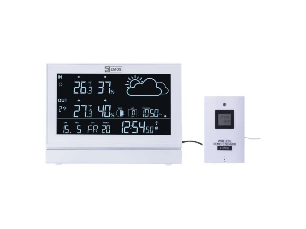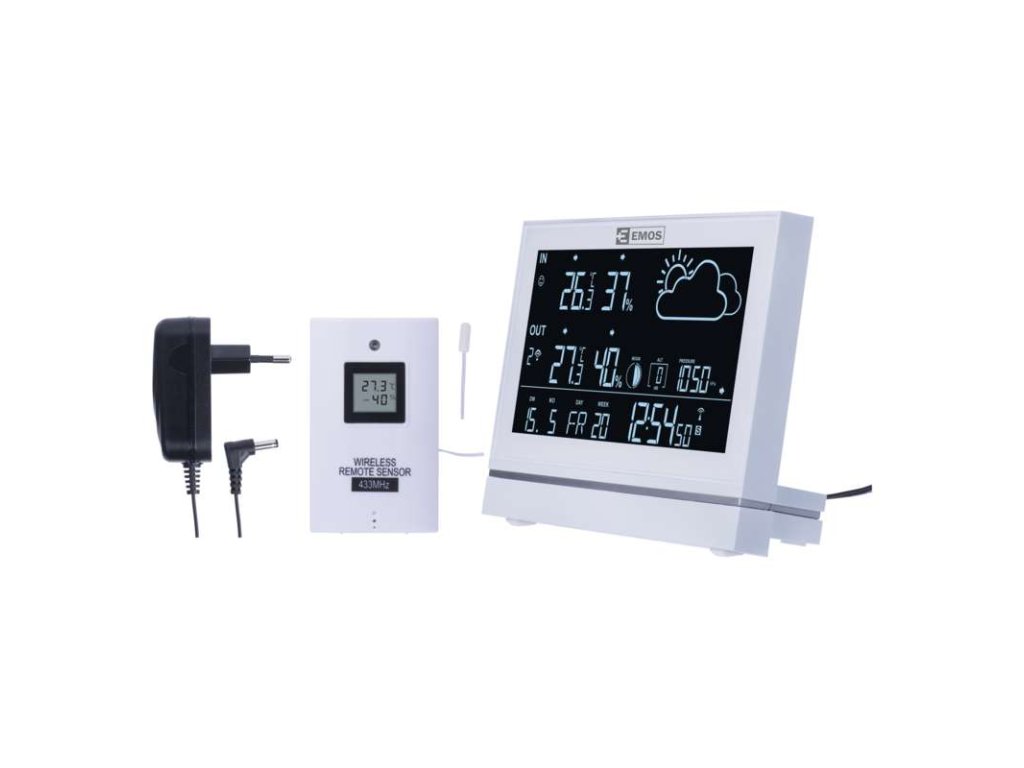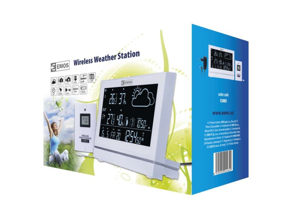Bílé LED podsvícení displeje, hodiny řízené rádiovým signálem, vnitřní a venkovní teplota a vlhkost, záznam max/min teploty a vlhkosti, možnost připojit až 3 čidla.