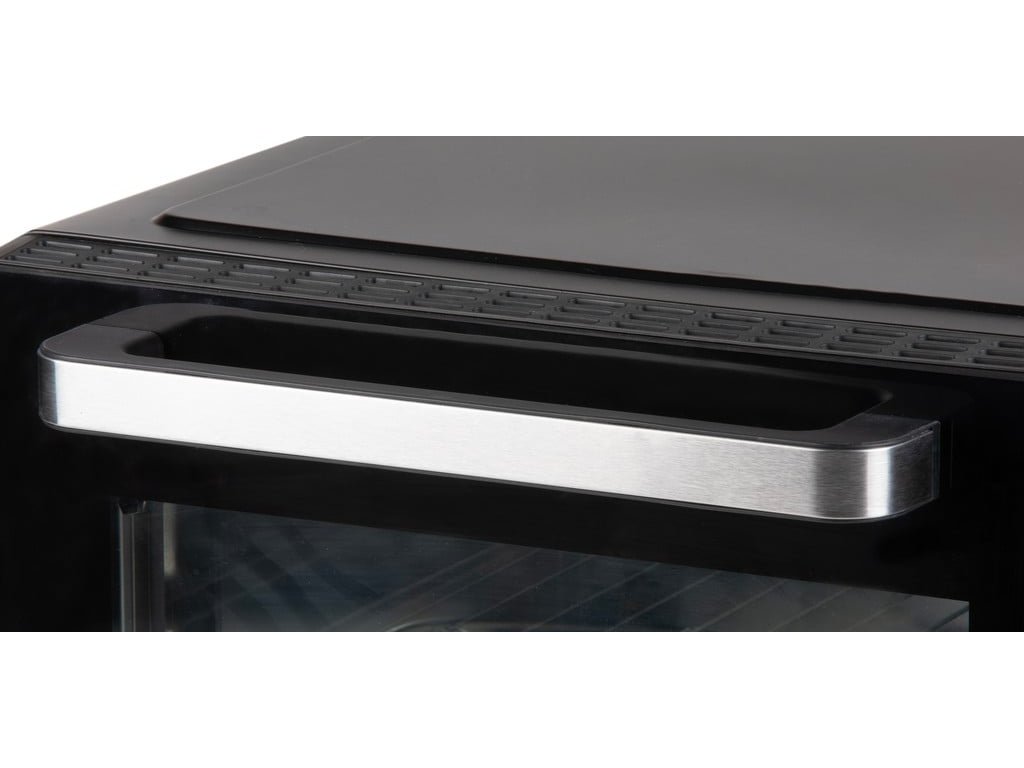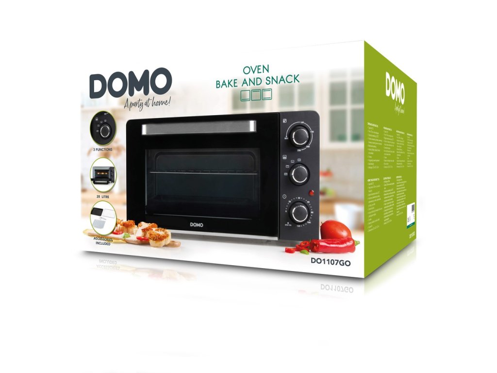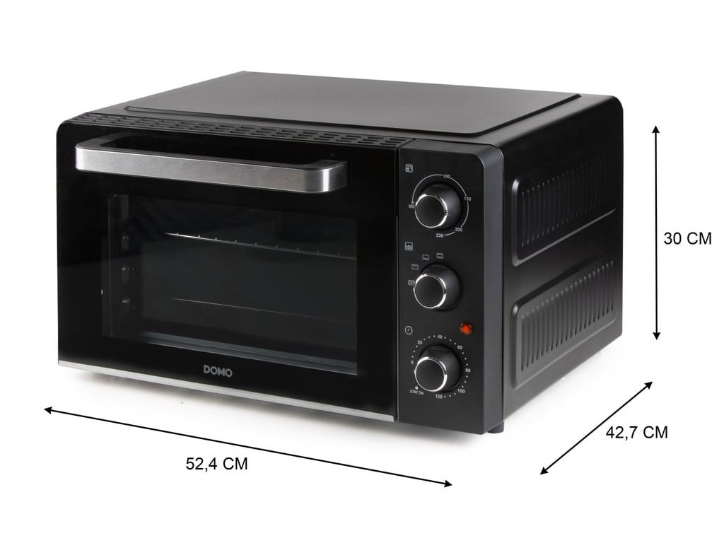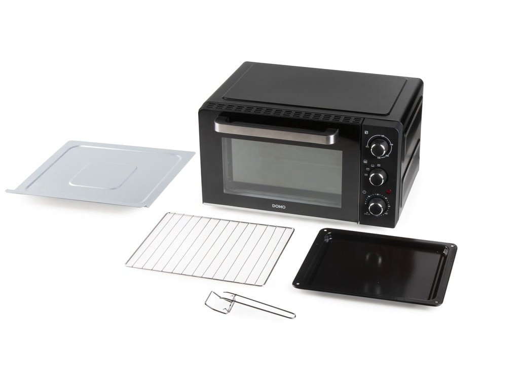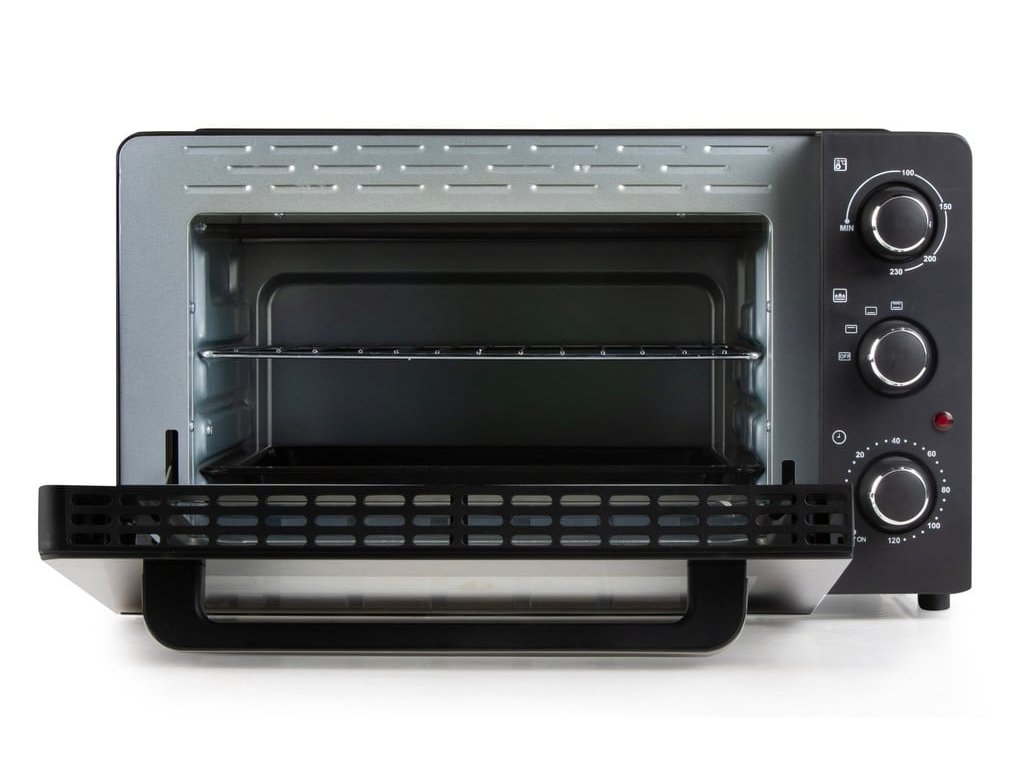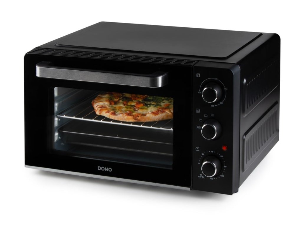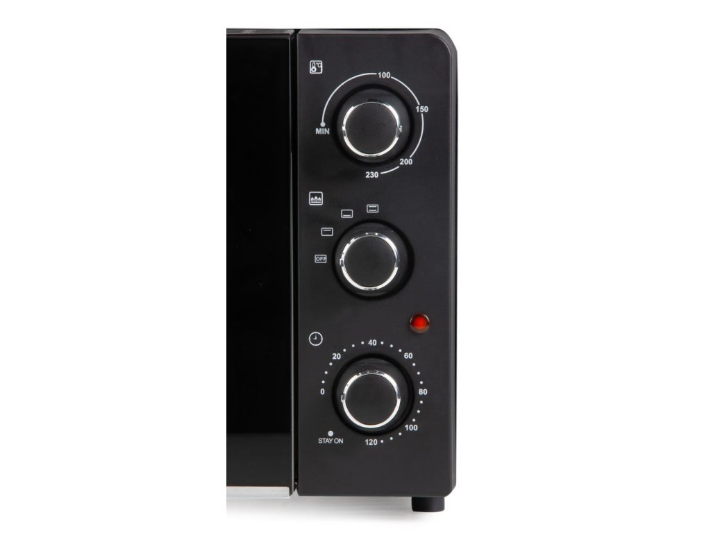 Elektrická pečící trouba 28 l s možností horního ohřevu, spodního ohřevu, nebo kombinace obou. Nastavitelný termostat do 230 °C a časovač 120 min. Včetně roštu a plechu na pečení.