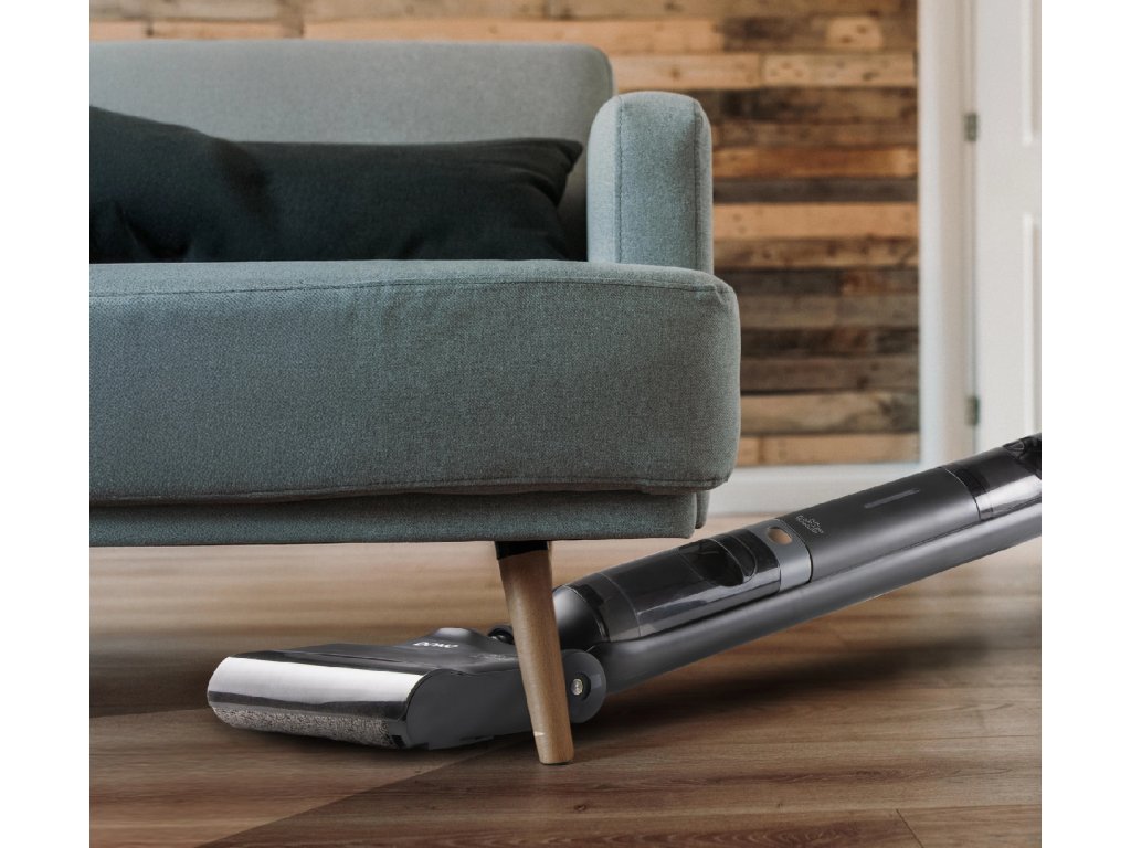Exkluzivní temná edice aku myčky podlahy s vysavačem. V jednom kroku sbírá nečistoty, vytírá i suší podlahu. Ušetří až 90% vody proti běžnému vytírání a vytře až 75 m2 plochy.