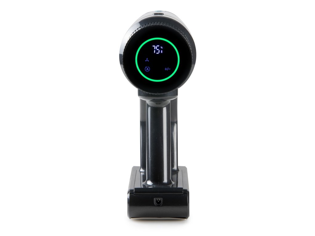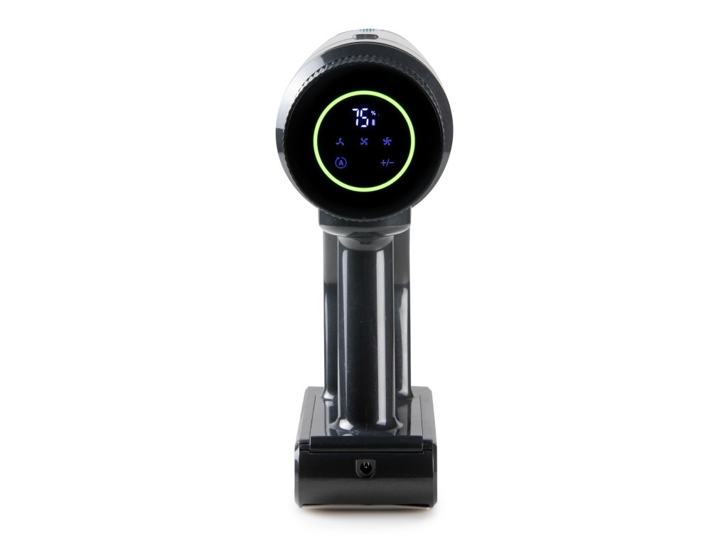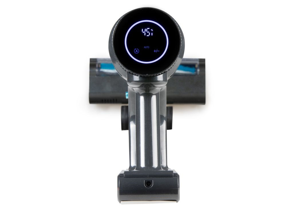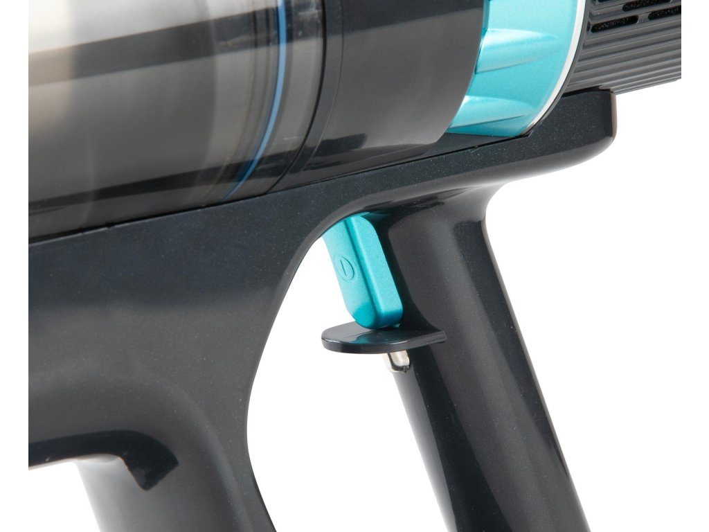 Tlačítko volby výkonu ve 2 stupních LED kontrolky stavu nabití baterie LED s výkonnými diodami osvětlujícími prostoru před hubicí Spoušť pro rychlé otevření a vysypání prachové nádoby
