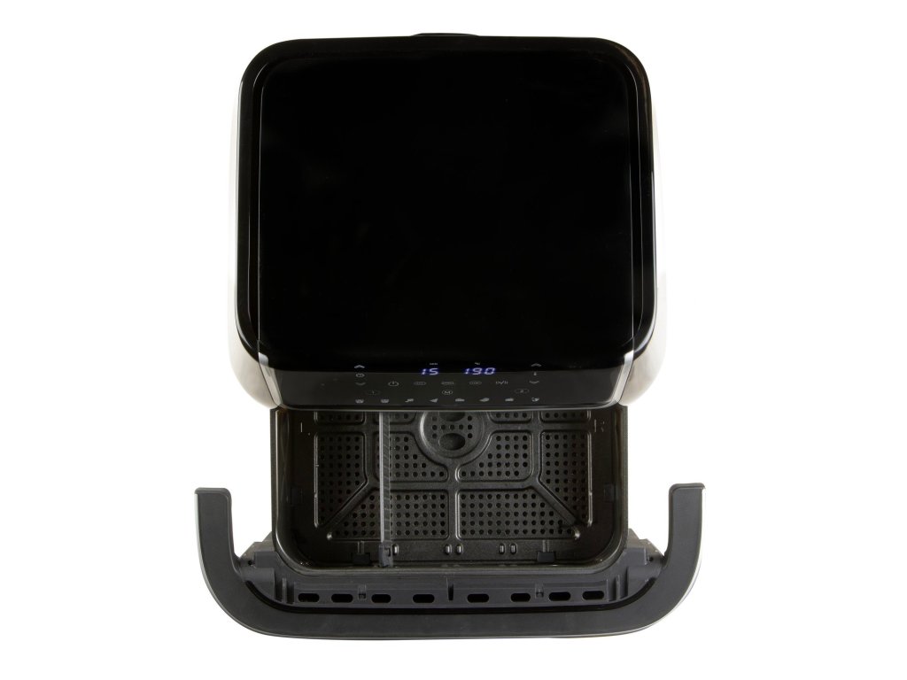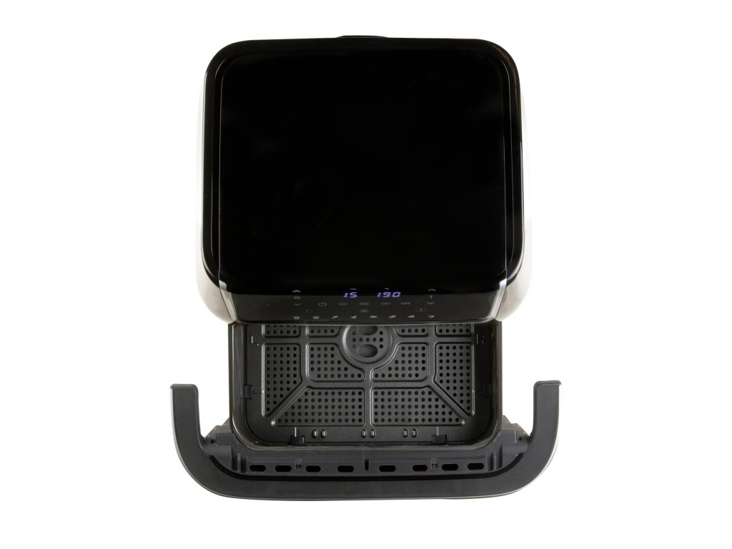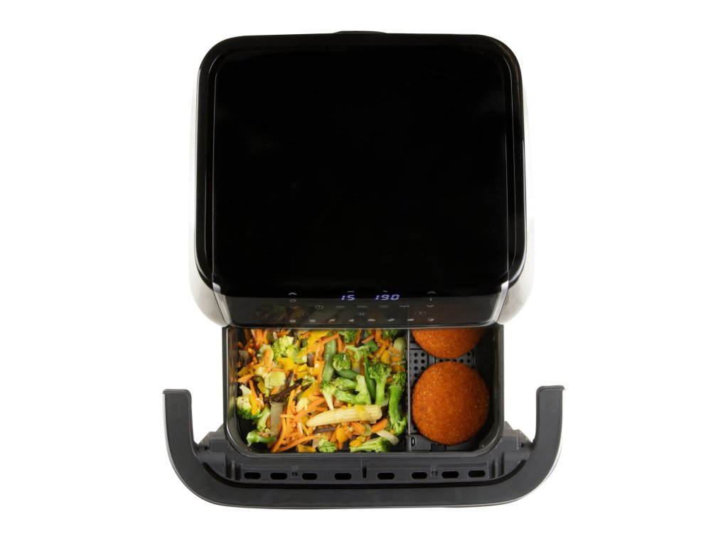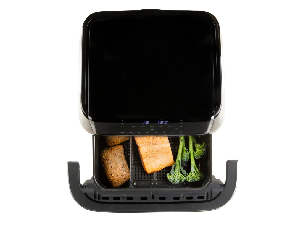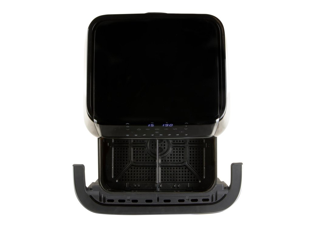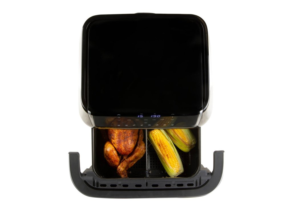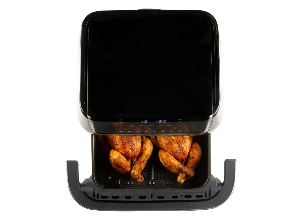 Horkovzdušná fritéza 10l s průzorem. Digitální termostat 80-200 °C. Časovač na 60 min. Rychlé nahřívání do 3 min. Skleněný průzor. Možnost rozdělení na 2 zóny.