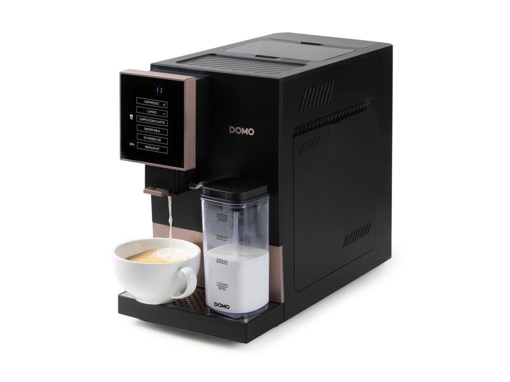 Automatický kávovar – espresso, lungo, cappuccino, latte jedním dotykem, tlak 19 bar, mlýnek, napěňovač mléka, LED displej, Thermoblock, nádržka 1,1l, mléko 400 ml, černý/bronz, 1350W