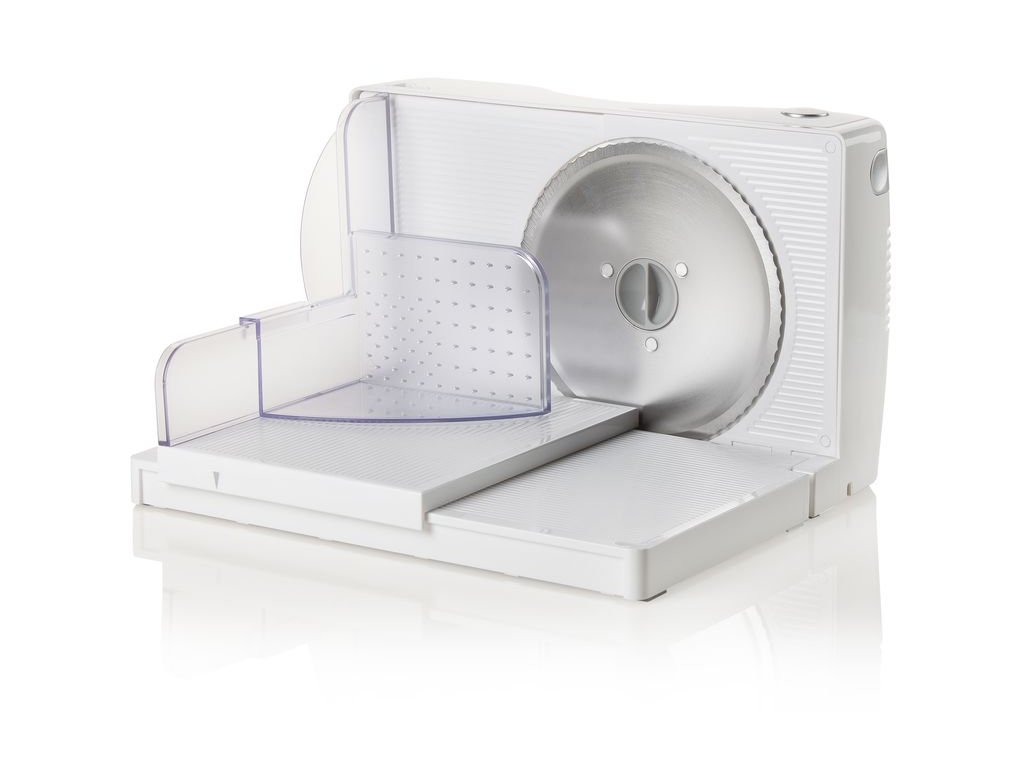 Elektrický kráječ potravin MS171T má ostrý kotouč s nastavitelnou šířkou plátků. Krájení je pohodlné díky profi nakloněné desce a kovovým částem, které zajistí stabilitu. Vysunovatelný nástavec posuvné desky oceníte při krájení potravin větších rozměrů.
