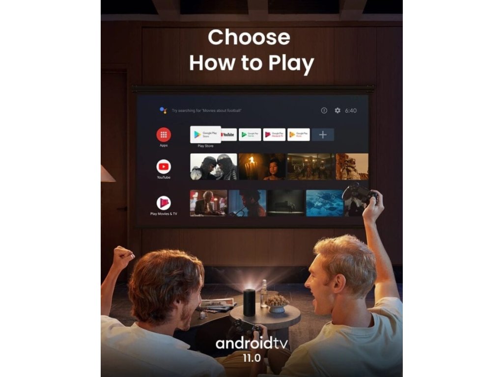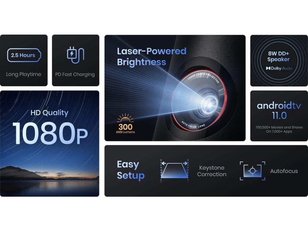 Přenosný LASER projektor, 300 ANSI lumenů, FHD (1920×1080), projekce 40 - 1200“, výdrž až 2,5 hodin, 8W reproduktor s Dolby Audio, WiFi, Bluetooth 5.1, Android TV 11.0, USB-C, Chromcast.