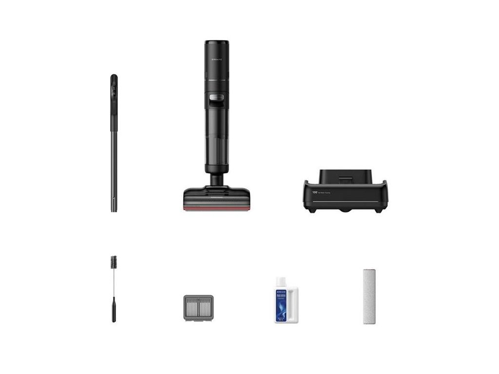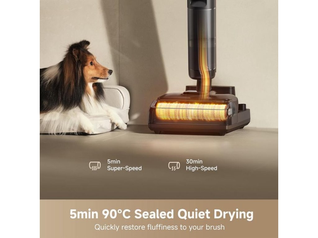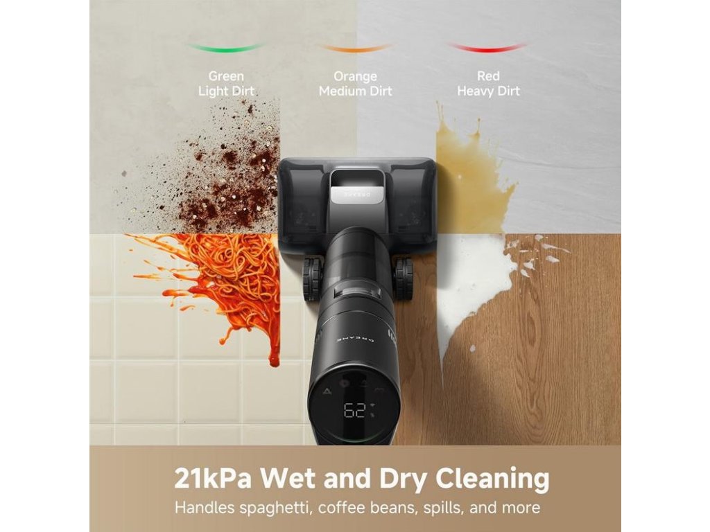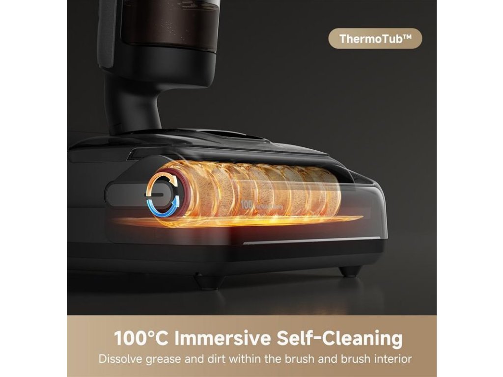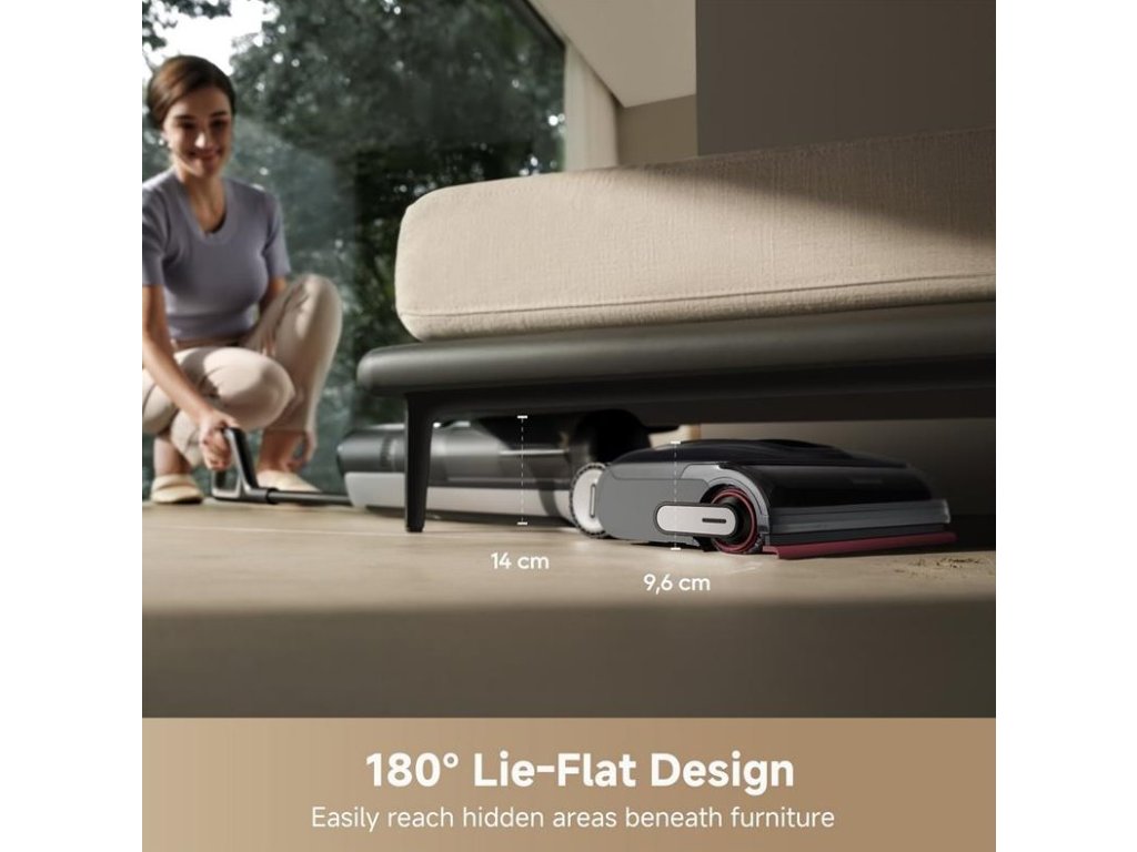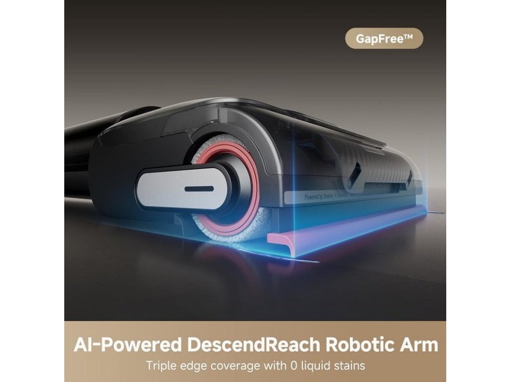 Dreame H15 Pro přináší revoluci v čištění podlah, Technologie GapFreeTM s pomocí AI zvedá robotickou přední stěrku a odstraňuje mezeru mezi kartáčem a stěnou a tím zanechá povrch bez skvrn od kapaliny. Sací výkon 21 000 Pa, čištění 100°C* horkou vodou!