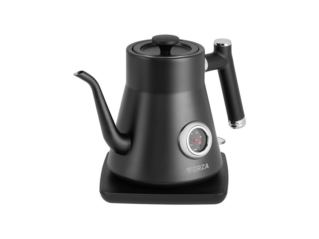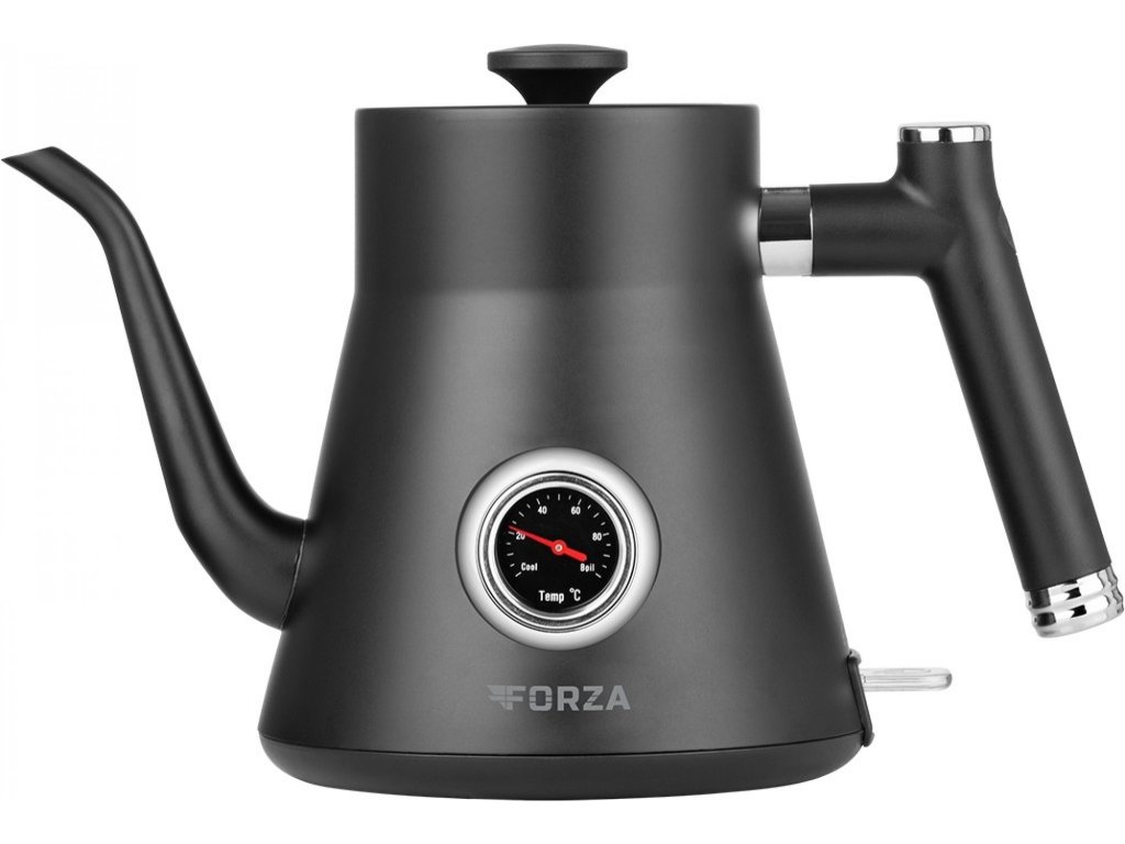 rychlovarná konvice s husím krkem • nerezové provedení (matný černý povrch) • objem 0,8 l • příkon 1000–1200 W • automatické vypínání v případě dosažení bodu varu • bezpečnostní ochrana proti suchému varu • konektor Strix • integrovaný analogový teploměr