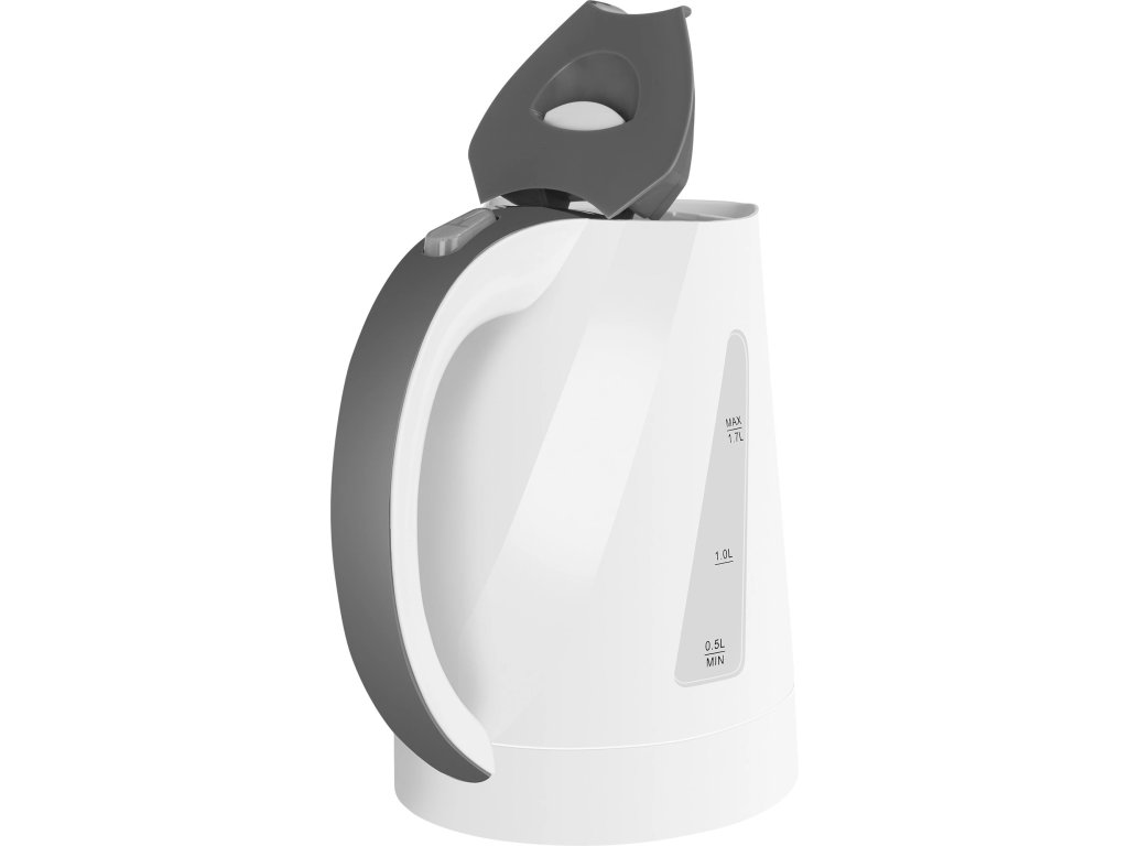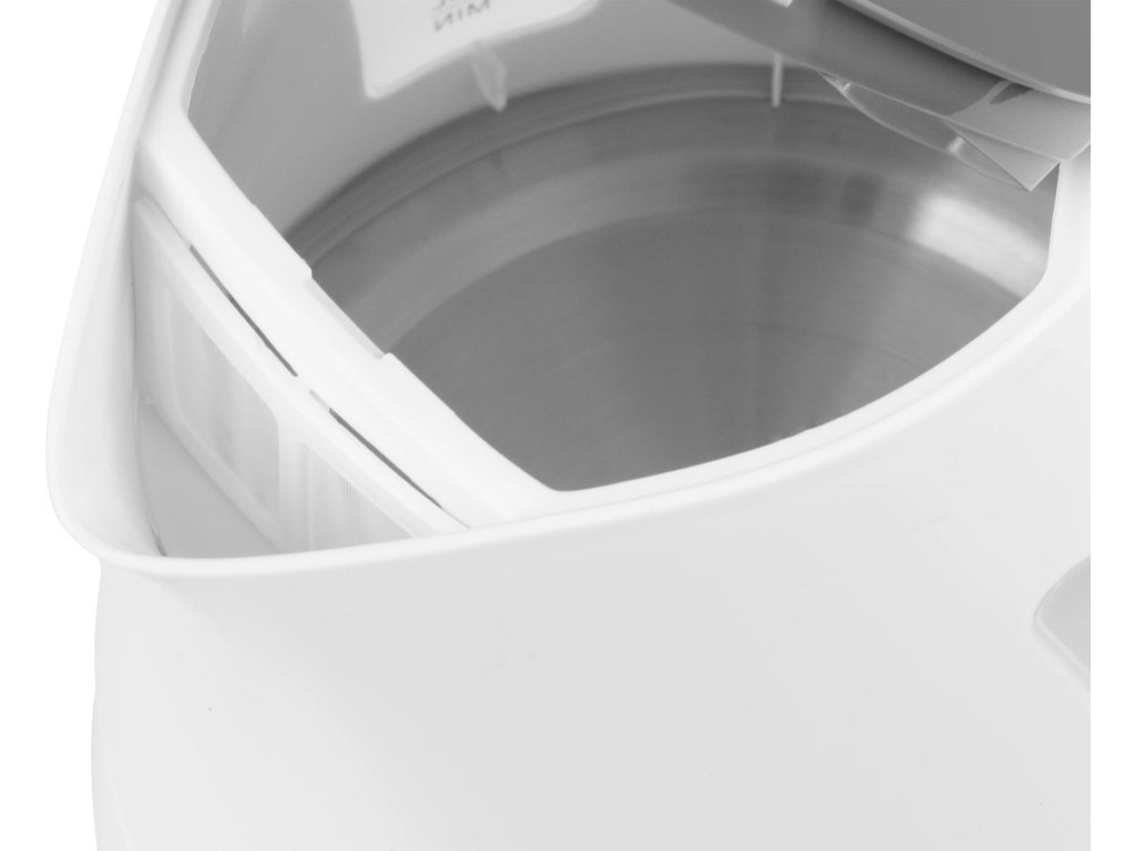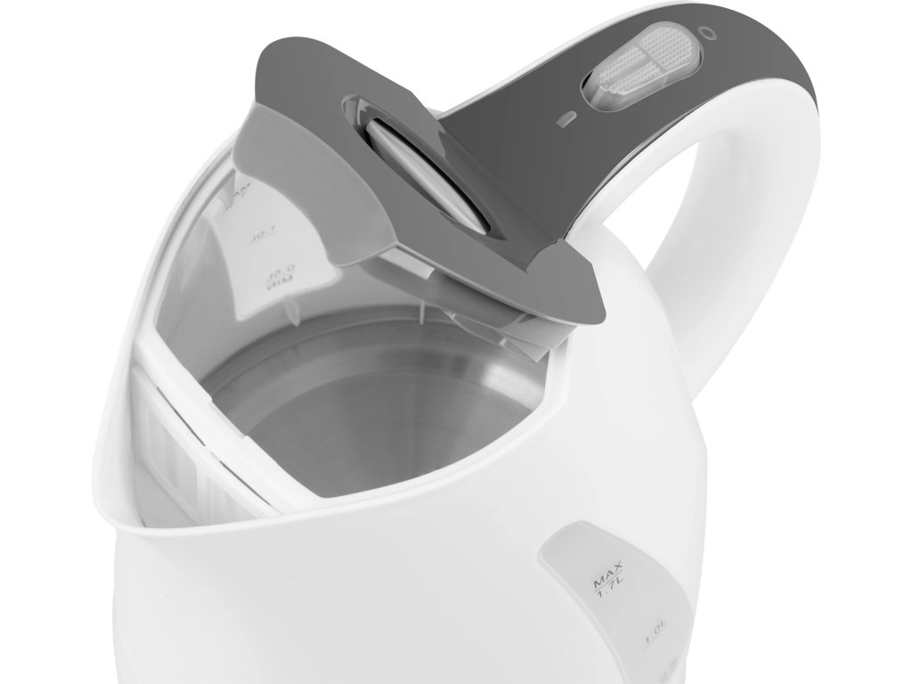 rychlovarná konvice, objem 1,7 l, oboustranný vodoznak, středový konektor, skryté topné těleso, 360° otočná základna s navíjením kabelu, odnímatelný a omyvatelný filtr, ochrana proti přehřátí při zapnutí bez vody, světelná kontrolka, bílá